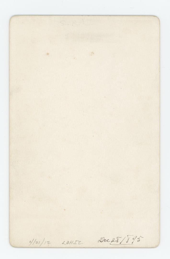 Image shows a woman wearing lace and showing off lace curtains. Dated 1895 on the backside. Taken By JJ Clements at Aristo Cabinets.