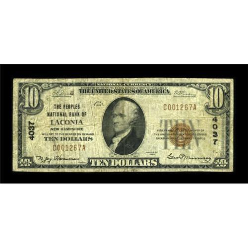 <B>Laconia, NH</B></I> - $10 1929 Ty. 1 <B>The Peoples NB</B></I> Ch. # 4037<BR> This well margined and wholly original note is evenly circulated. <B>Fine,</B></I> scarce.<BR><BR><b>Shipping:</b> Coins & Currency (<a target="_blank" href="http://www.heritageauctions.com/common/shipping.php">view shipping information</a>)