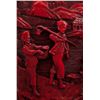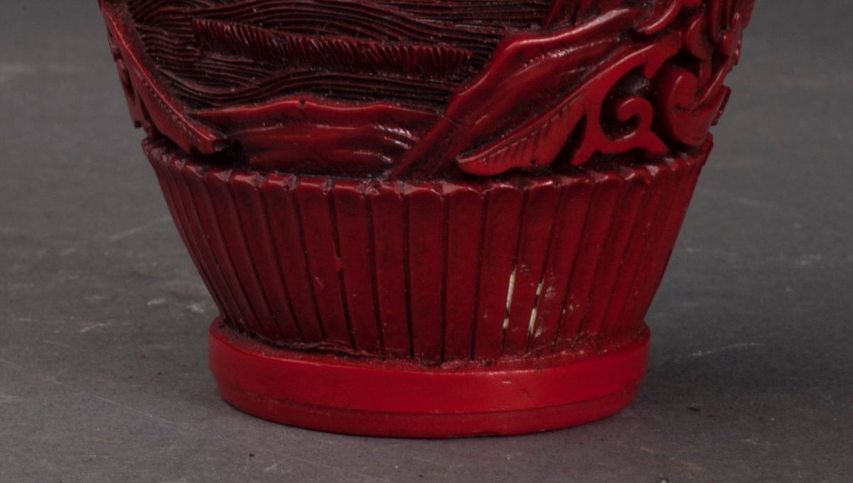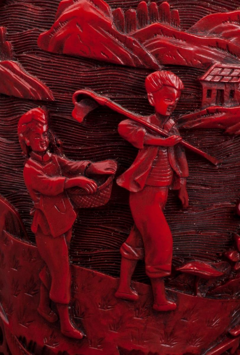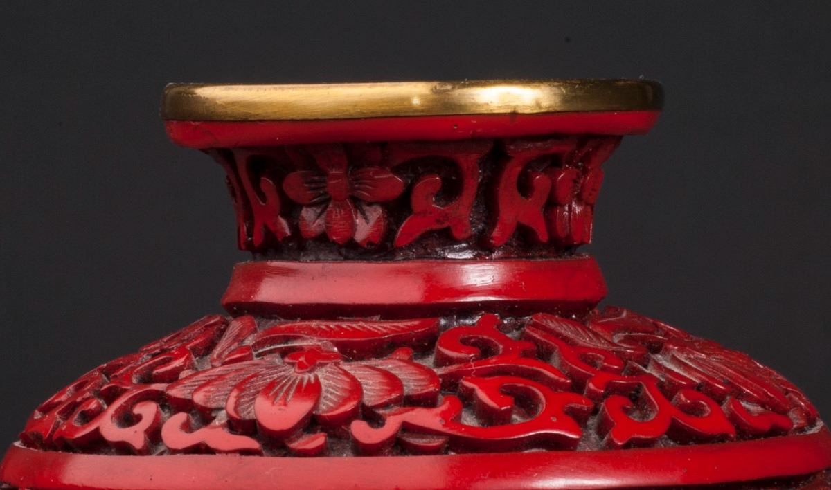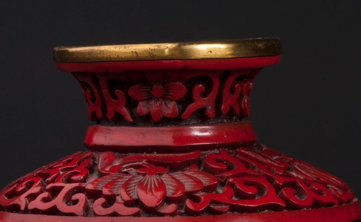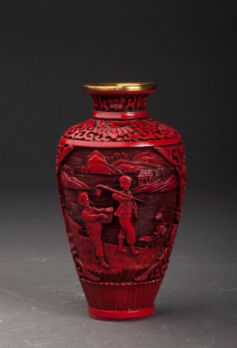 A Fine Lacquer Ware Pot, With A Skilled Figure Carving On The Body; Nice Red Color, Gilded Opening.