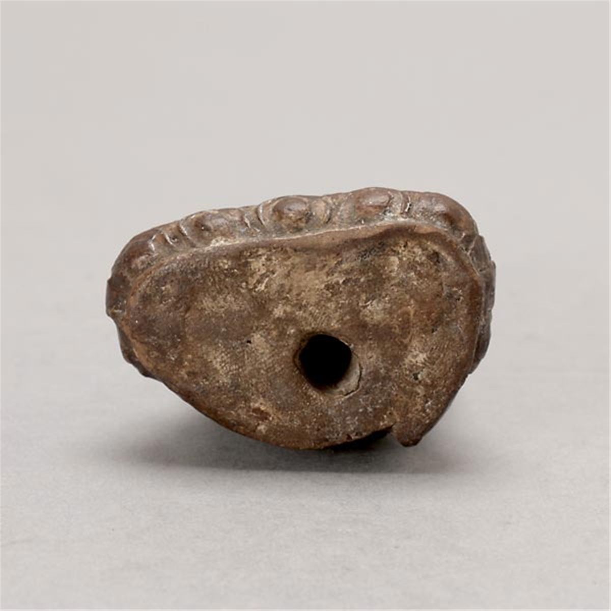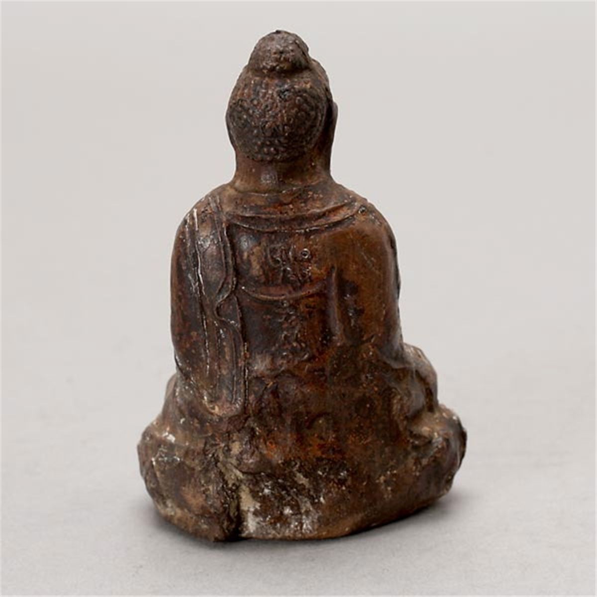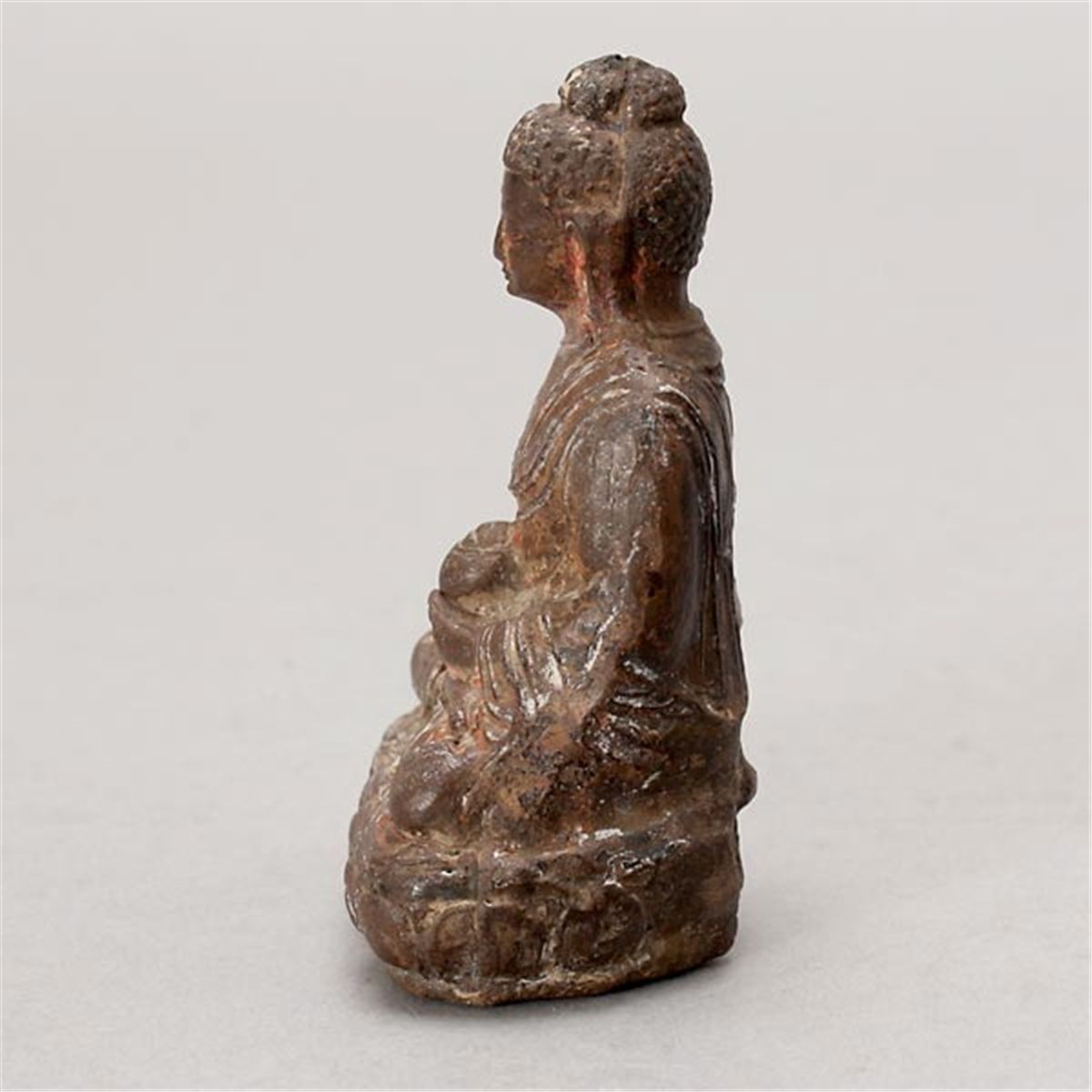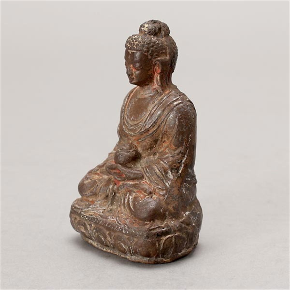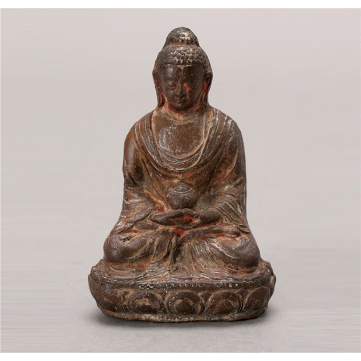 A Lacquered Figure of the Buddha, Wearing a naturally flowing robe, seated in dhyanasana mudra upon a lotus pedestal, his hands crossed in his lap and holding a beggar’s bowl, the finely cast face in an expression of serene contemplation, downcast eyes; the back with subtly raised Sanskrit characters; traces of paint. 10th Century or Later, Height: 3 1/4 inches (8.3 cm) [Surface wear, losses paint. This condition report states major condition issues only.]