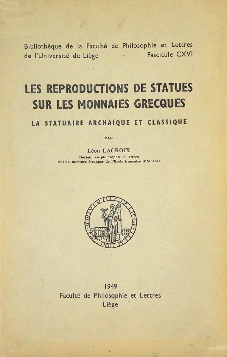 Lacroix, Léon. LES REPRODUCTIONS DE STATUES SUR LES MONNAIES GRECQUES: LA STATUAIRE ARCHAìQUE ET CLASSIQUE. Liège, 1949. 8vo, original printed card covers. (2), xxii, 372, (2) pages; 28 fine plates; 15, (1) pages. Unopened and fine. Rare and important. Lacroix died only just recently, on August 1, 2016, at the amazing age of 106. Clain-Stefanelli 3466*. Daehn 985. Grierson 59.