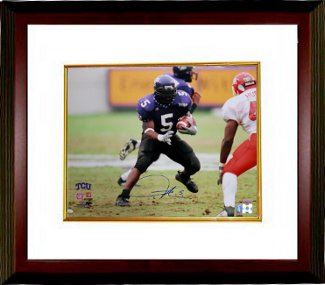 In the 1998 season Ladainian Tomlinson helped the TCU Horned Frogs win its first bowl win in 41 years against the University of Southern California in the Sun Bowl. During his junior season in 1999, he set an NCAA record for yards in one game with 406 against UTEP. He ended the year with an NCAA-leading 1,850 yards rushing to go along with 18 touchdowns. In his senior season in 2000, Tomlinson led the NCAA for the second time with 2,158 yards and 22 touchdowns while adding 354 yards receiving. He won the Doak Walker Award as the nation's best running back, and was a finalist for the Heisman. Ladainian Tomlinson has hand autographed this TCU Horned Frogs 16x20 Photo. Tomlinson Hologram and Certificate of Authenticity from Athlon Sports. Custom White Mat and Premium Mahogany Color Framed as shown.