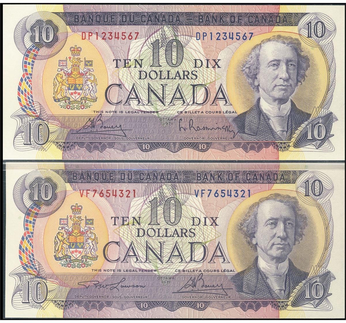 Ladder; 1971 $10 BC-49b #DP1234567 & BC-49c #VF7654321 both original UNC notes.