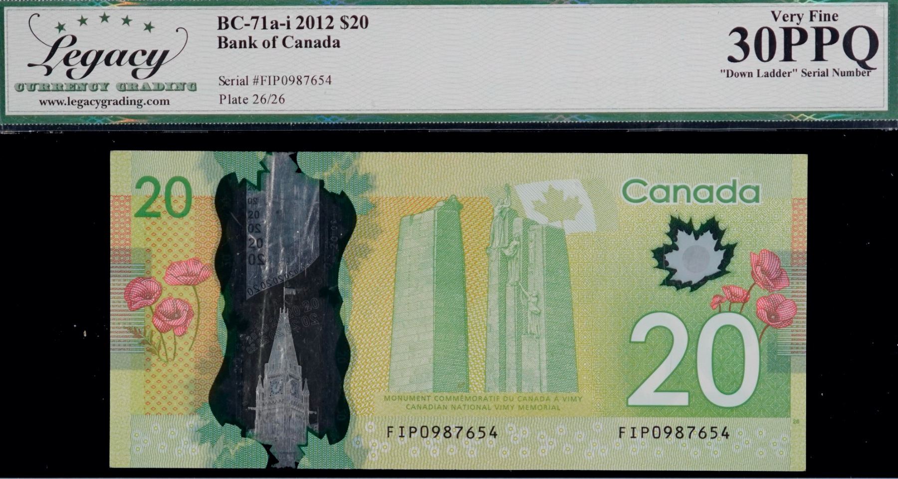 Ladder; 2012 $20 BC-71a-i Legacy Currency Grading Choice Very Fine-30PPQ FIP0987654 "Down Ladder" Serial Number
