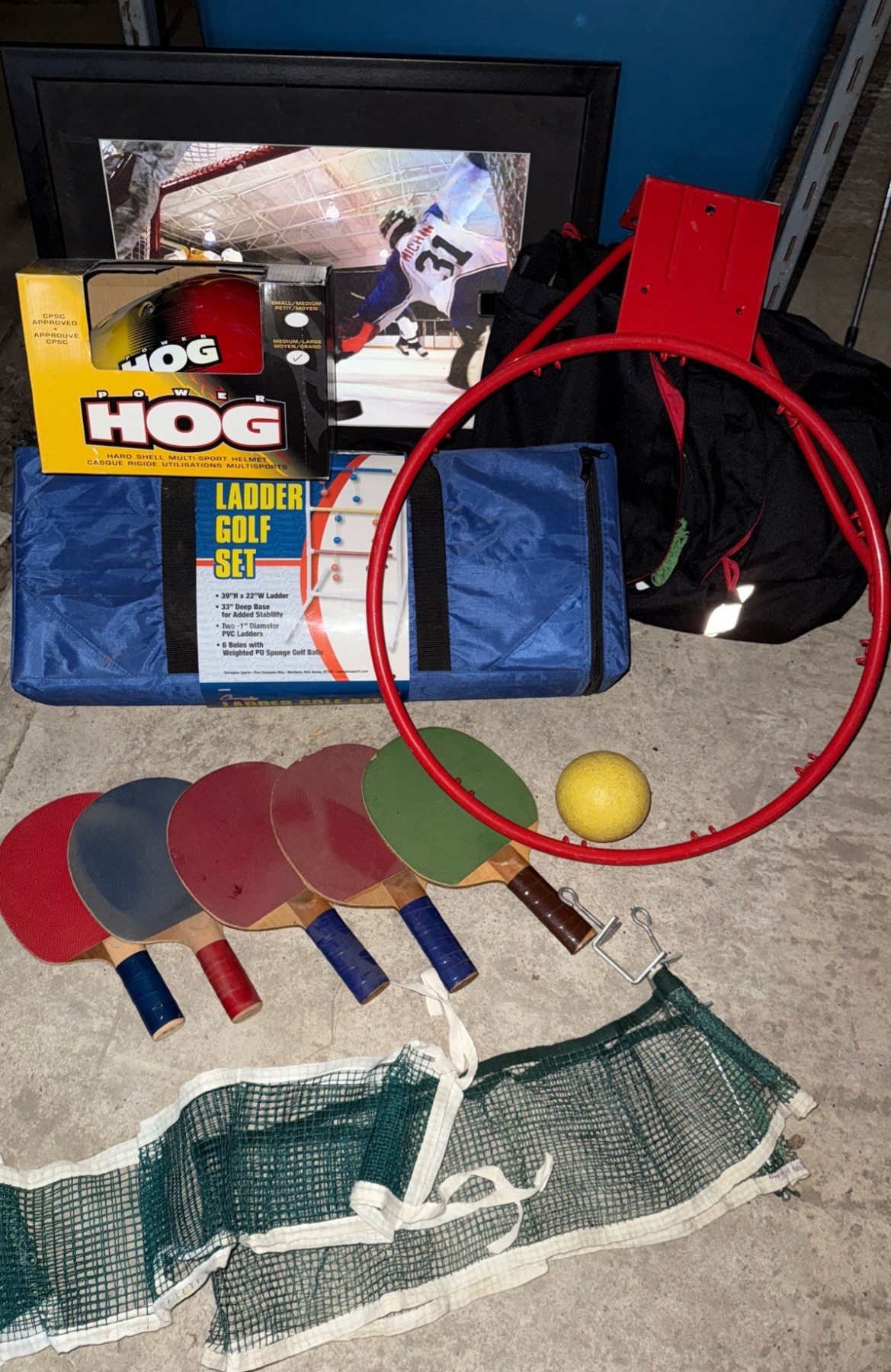 Ladder Golf Set, BasketBall Hoop, Hog Helmut, Ping Pong Net & Paddles