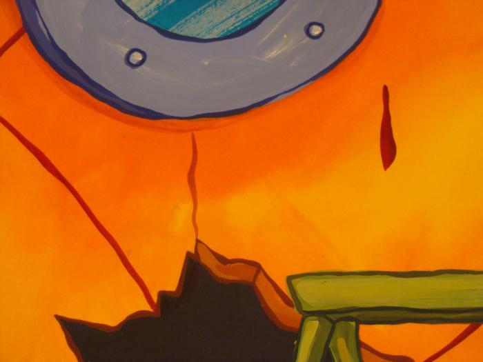 This original hand-painted background and animation cel are from the Nickelodeon TV show SpongeBob Squarepants. The story takes place under the deep blue sea in Bikini Bottom, where SpongeBob resides. SpongeBob, who is a yellow, porous sponge, is your typical happy-go-lucky character, as he is always cheerful and enjoys making people laugh. Patrick Star, SpongeBob's neighbor who is a starfish, is your average children's show idiot, as he boasts knowing nothing and is often getting himself into ridiculous situations. Between the homes of these two lies the home of the miserable Squidward, a squid, who is known for being grouchy and playing tricks on SpongeBob and Patrick. Both SpongeBob and Squidward work at the Krusty Krab, a fast food business run by the greedy money-loving Mr. Krabs, a crab, the arch rival of the evil, possibly misunderstood, Plankton. Another neighbor, Sandy Cheeks, an athletic squirrel who normally wears an astronaut's space suit, was introduced in "Tea at the Treedome." She spends most of her time inventing and experimenting. What happened to SpongeBob's house.Original Production Background and Animated Cel Overall Size of Background: 10 1/2" x 12 3/4" Overall Size of the Cel: 10 1/2" x 12 1/2" Very good condition This is an original hand-painted cel set-up used in the production of an episode of "SpongeBob SquarePants." Each one-of-a-kind set-up represents a slight change in position of the characters. When individually photographed and projected in rapid succession, the images appear to move.