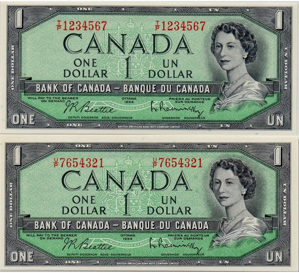 Ladder issue; 1954 $1 BC-37b #TP1234567, PMG Gem UNC65EPQ and 1954 $1 BC-37b Ladder #UP7654321, PMG Gem UNC65EPQ.