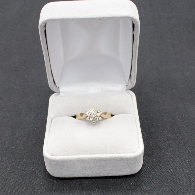 Ladies 10 karat yellow gold diamond cluster ring. Weighs 2.9 grams (size 6).