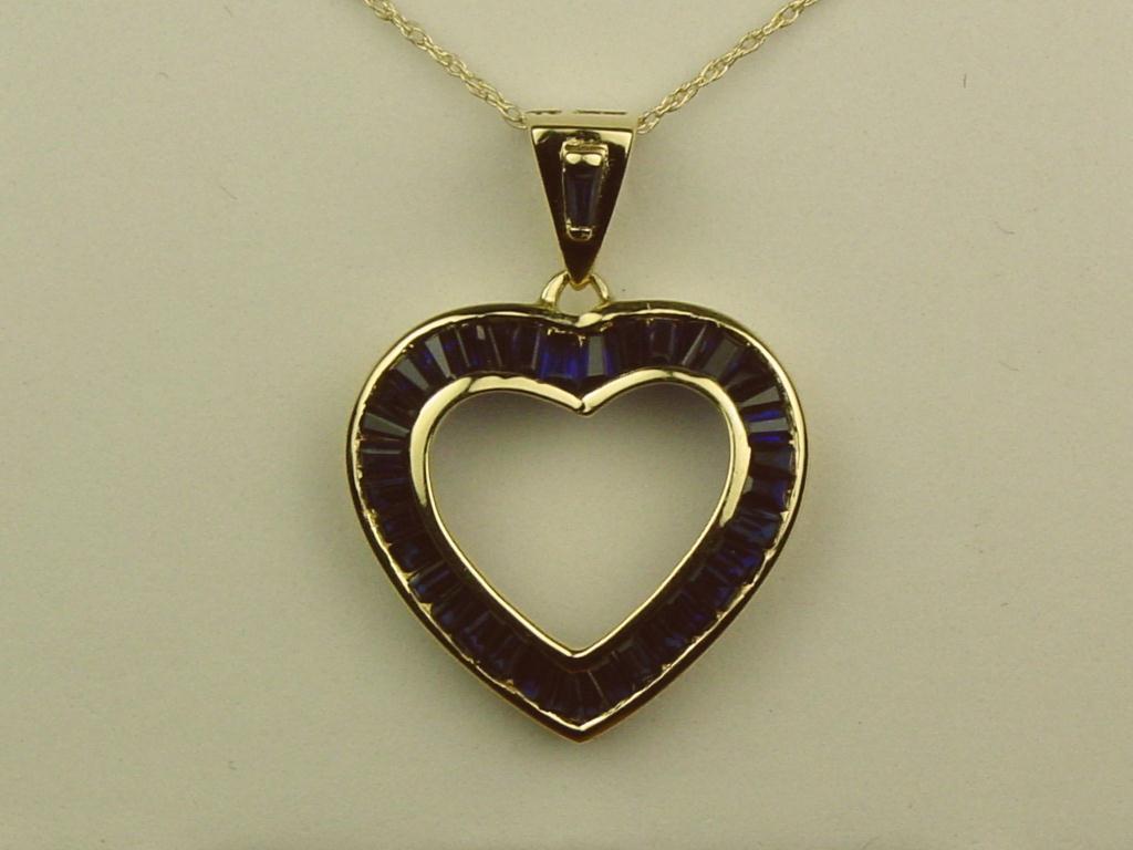 Ladies 10K YG Heart Design Pendant Custom made, channel set with over 1.00 carat in fine color blue