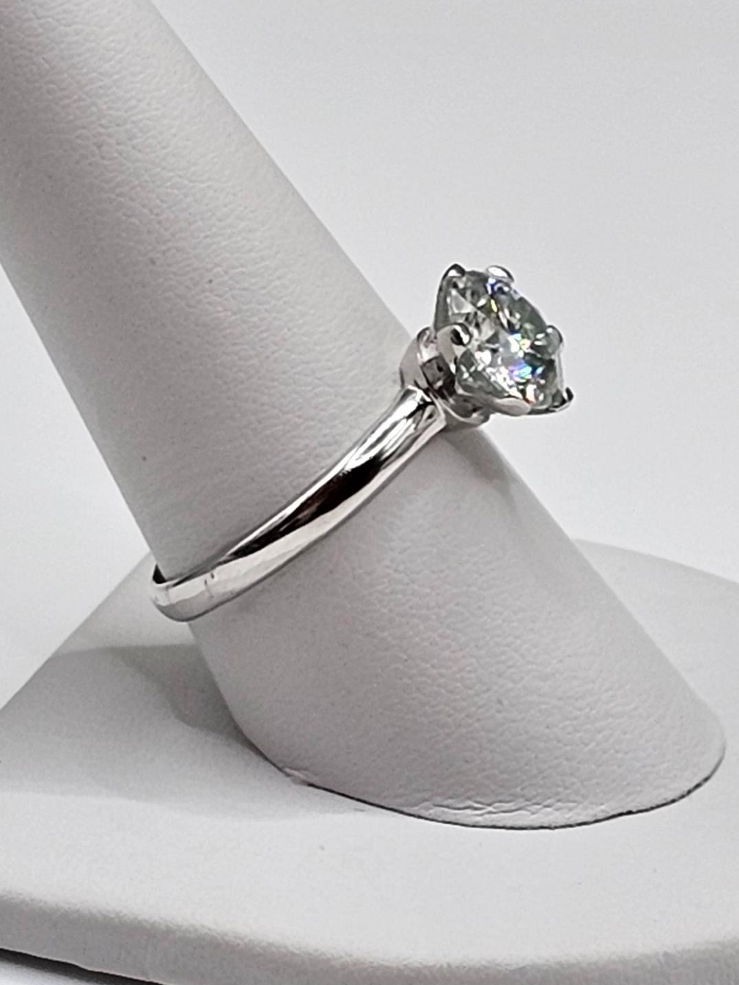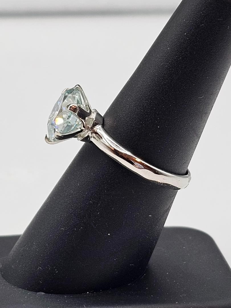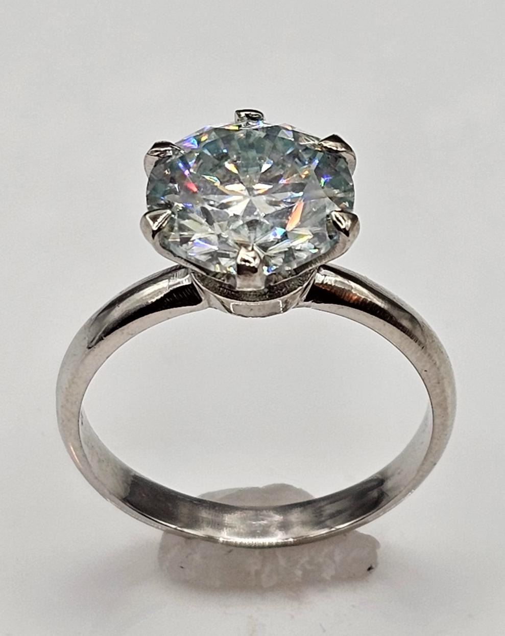 This Huge 5 Ct Lab Simulated Diamond Solitaire is a Brilliant Round Cut Measuring 11 mm. The Color is Bright Ice White. It is eye clean and bursting out with a full spectrum of colors. It Is Mounted In 14 Kt White Gold Plate which gives this ring its high polish and shine. It is also conflict free and earth friendly. Ring size 7.5. The total weight is approx. 4.6 grams.