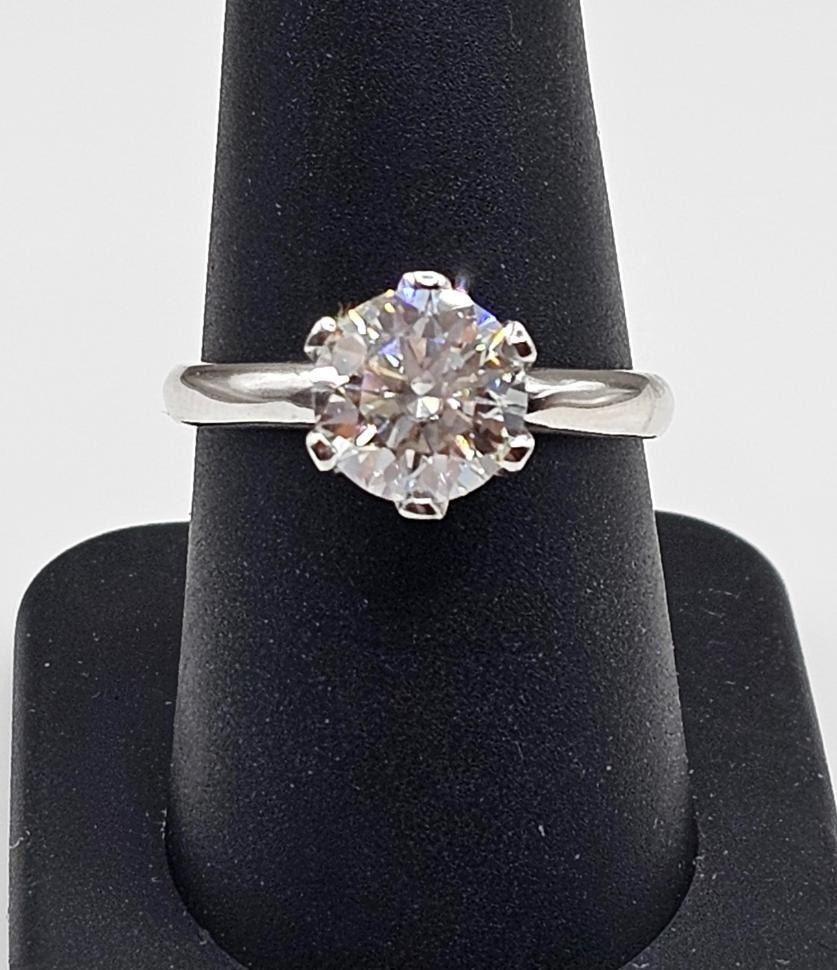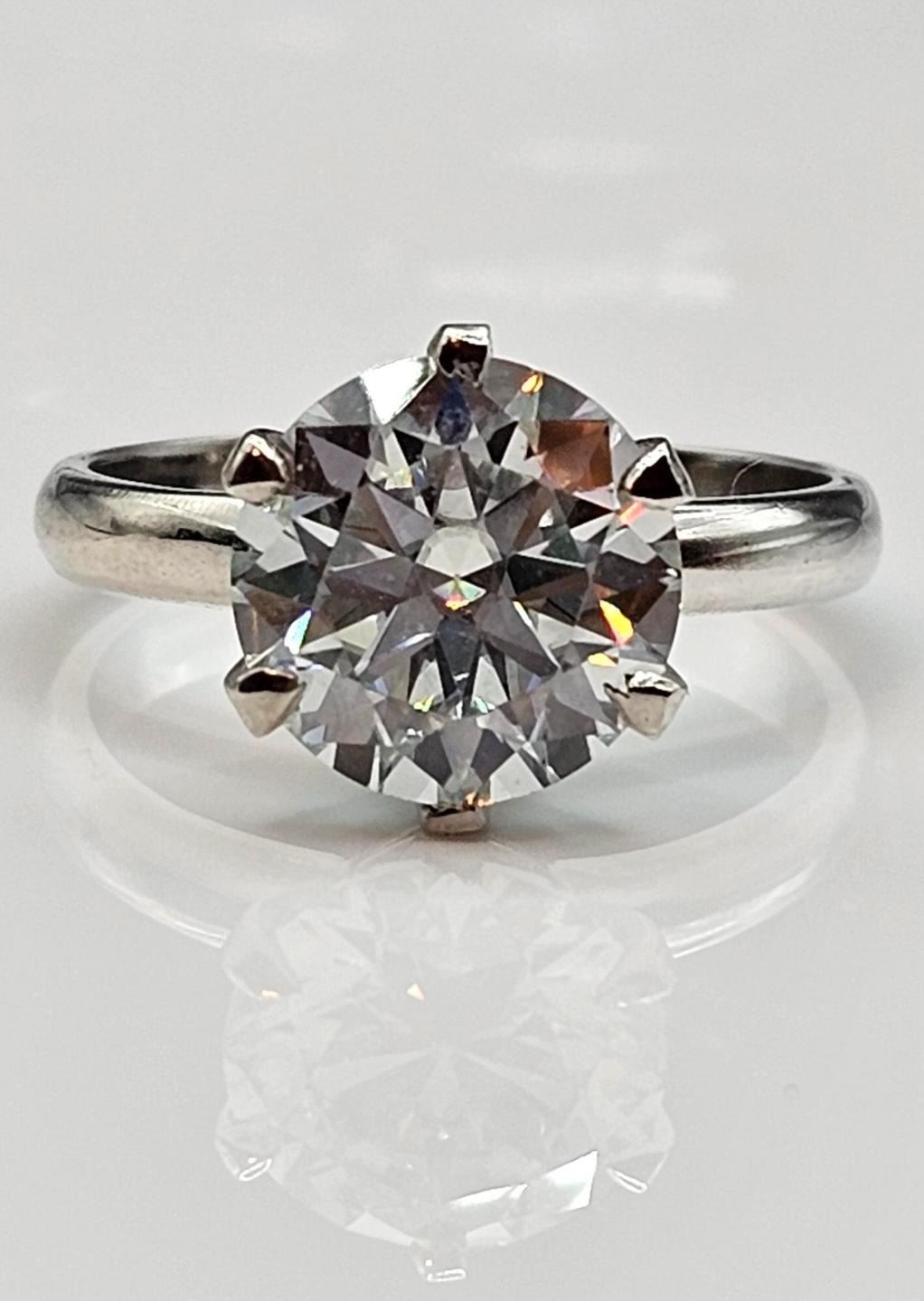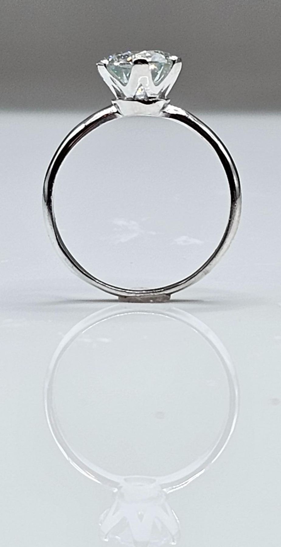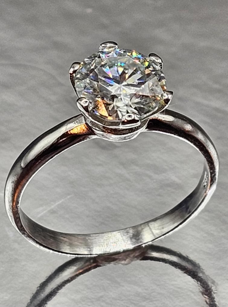 This Huge 5 Ct Lab Simulated Diamond Solitaire is a Brilliant Round Cut Measuring 11 mm. The Color is Bright Ice White. It is eye clean and bursting out with a full spectrum of colors. It Is Mounted In 14 Kt White Gold Plate which gives this ring its high polish and shine. It is also conflict free and earth friendly. Ring size 7.5. The total weight is approx. 4.6 grams.