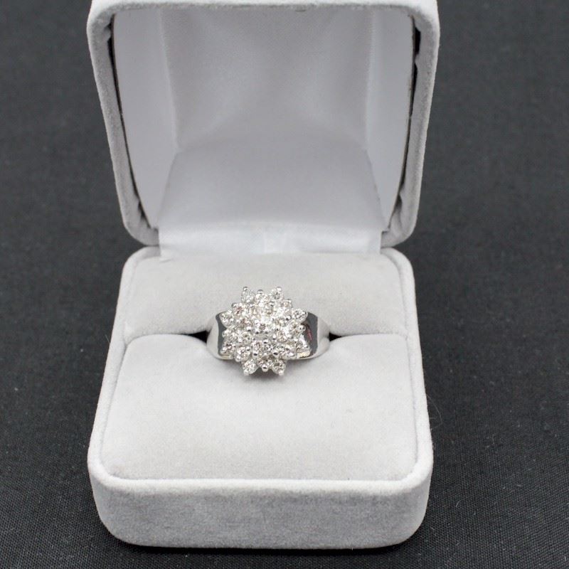 Ladies 14 karat white gold diamond cluster ring. Weighs 5.5 grams (size 6).