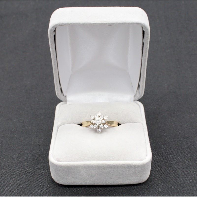 Ladies 14 karat yellow gold diamond cluster ring. Weighs 3.6 grams (size 5.5).