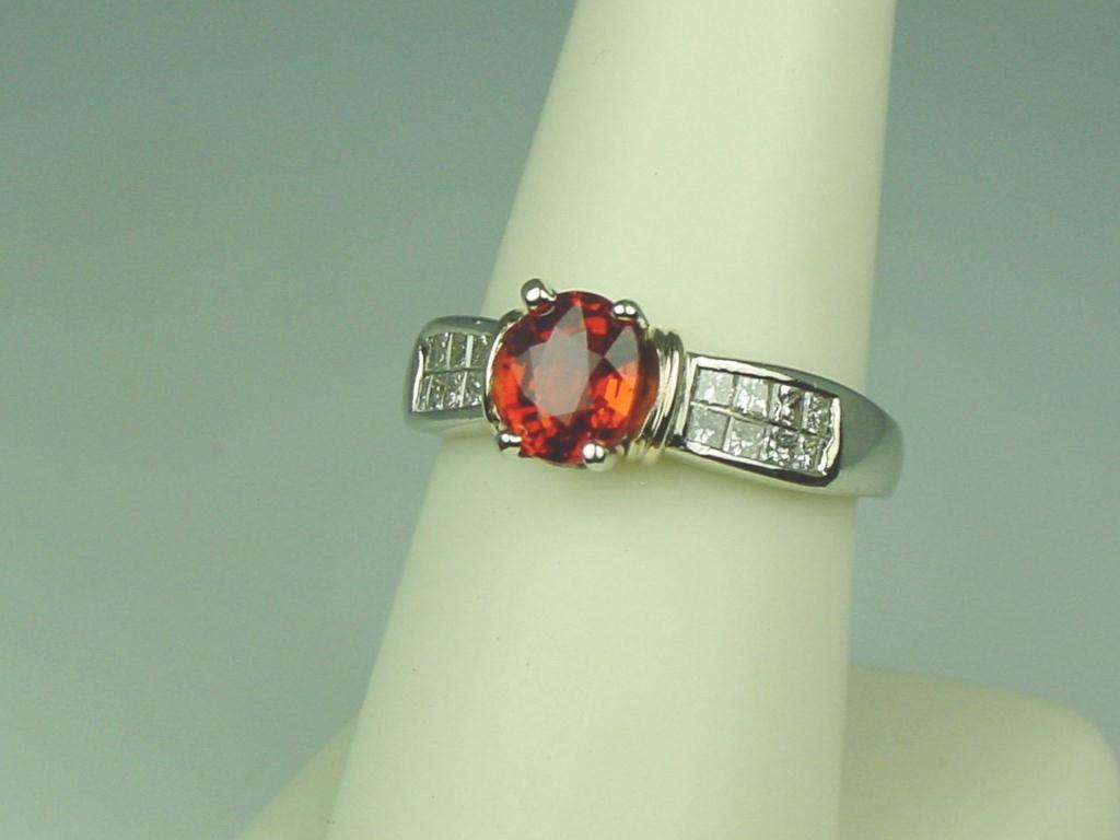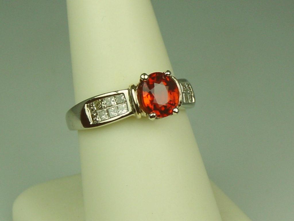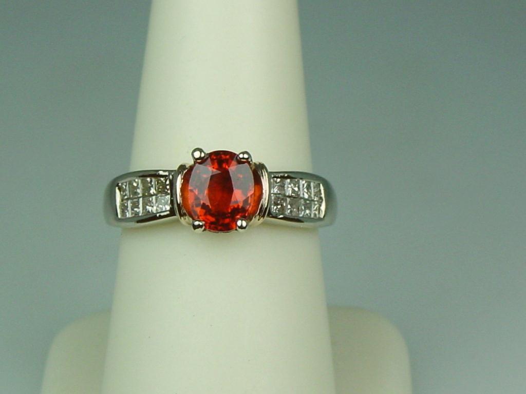 Ladies 14K 2-Tone Gold Custom Made Ring Set with a fine center reddish/orange sapphire weighing 1.58 carats and invisible set with 16 princess cut diamonds weighing approx. 0.70 carats of H-I colors and mostly VS clarity. Retail: $2,450.00Set with a fine center reddish/orange sapphire weighing 1.58 carats and invisible set with 16 princess cut diamonds weighing approx. 0.70 carats of H-I colors and mostly VS clarity. Retail: $2,450.00