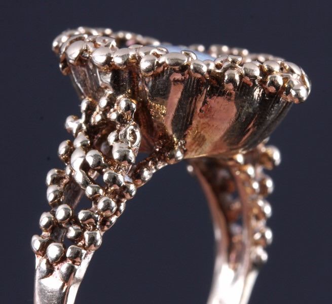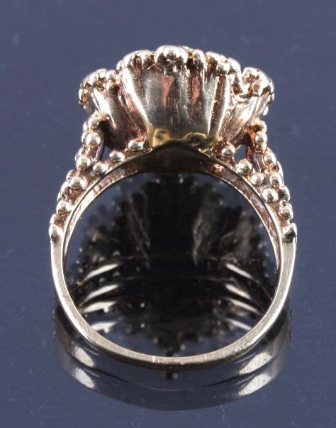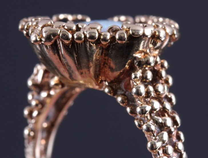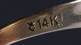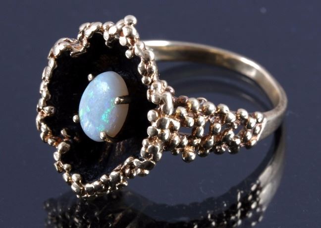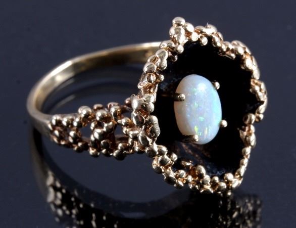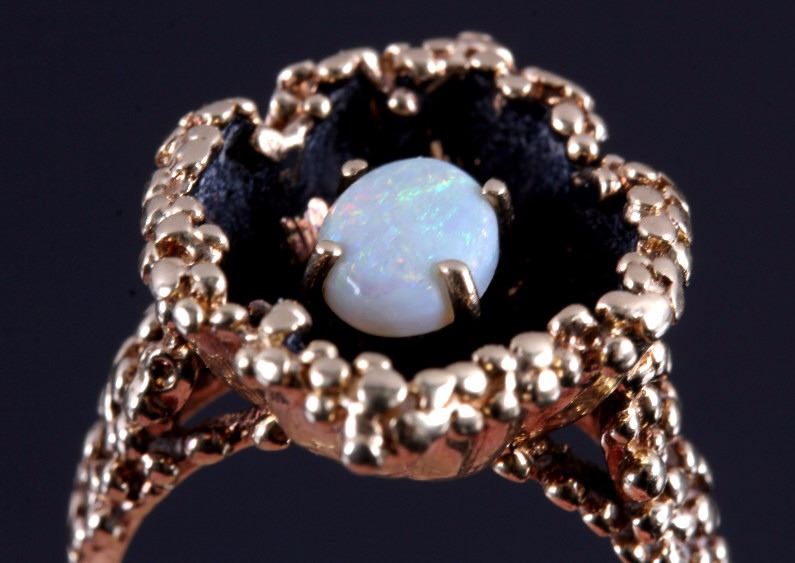 This is a ladies 14K gold and fire opal shadow box ring. The ring features a stunning opal cabochon showing brilliant fire and flash with colors of green, red and blue. The opal is set in a unique shadow box style surrounded by the 14K gold setting. The ring is marked "14K" for the yellow gold content. The ladies opal ring is in good condition. It is size 6. The opal measures 5mm x 7mm.