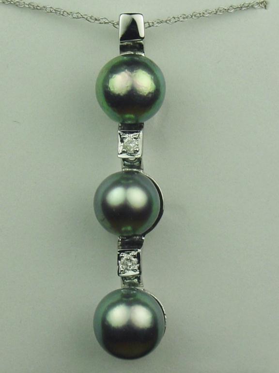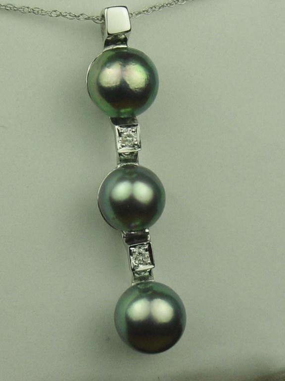 Ladies 14K WG Custom Design Pendant Set with 3 round blue/gray pearls averaging 7.00mm in diameter and side diamonds. Retail: $995.00Set with 3 round blue/gray pearls averaging 7.00mm in diameter and side diamonds. Retail: $995.00