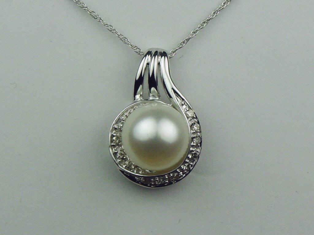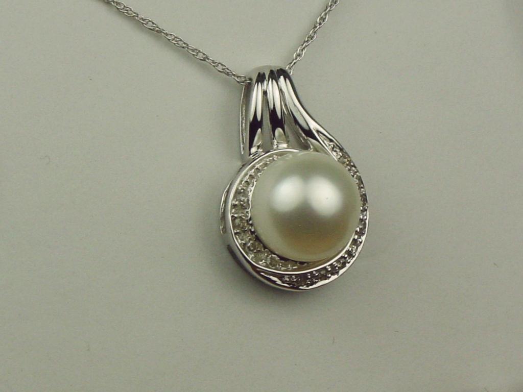 Ladies 14K WG Custom Made Pendant Set with a center fancy shape pearl averaging 9.00mm in diameter and pave set with 12 round diamonds weighing approx. 0.15 carats of H-I colors and SI clarity. Retail: $1,250.00Set with a center fancy shape pearl averaging 9.00mm in diameter and pave set with 12 round diamonds weighing approx. 0.15 carats of H-I colors and SI clarity. Retail: $1,250.00