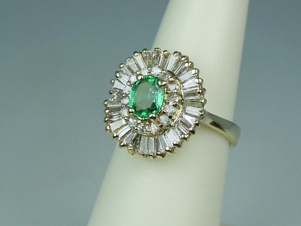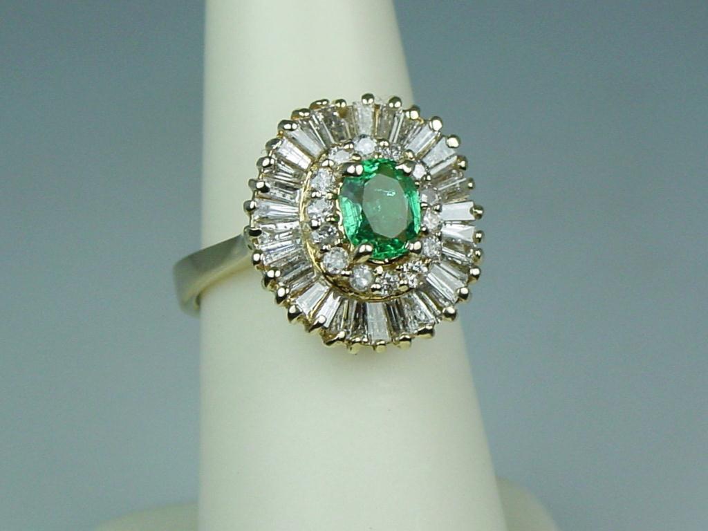 Ladies 14K YG Ballerina Design Ring Set with a center bright fern green Colombian Emerald weighing approx. 0.80 carats and surrounded by baguette and round diamonds weighing approx. 2.00 carats of H-I colors and SI/I clarity. Retail: $2,950.00Set with a center bright fern green Colombian Emerald weighing approx. 0.80 carats and surrounded by baguette and round diamonds weighing approx. 2.00 carats of H-I colors and SI/I clarity. Retail: $2,950.00