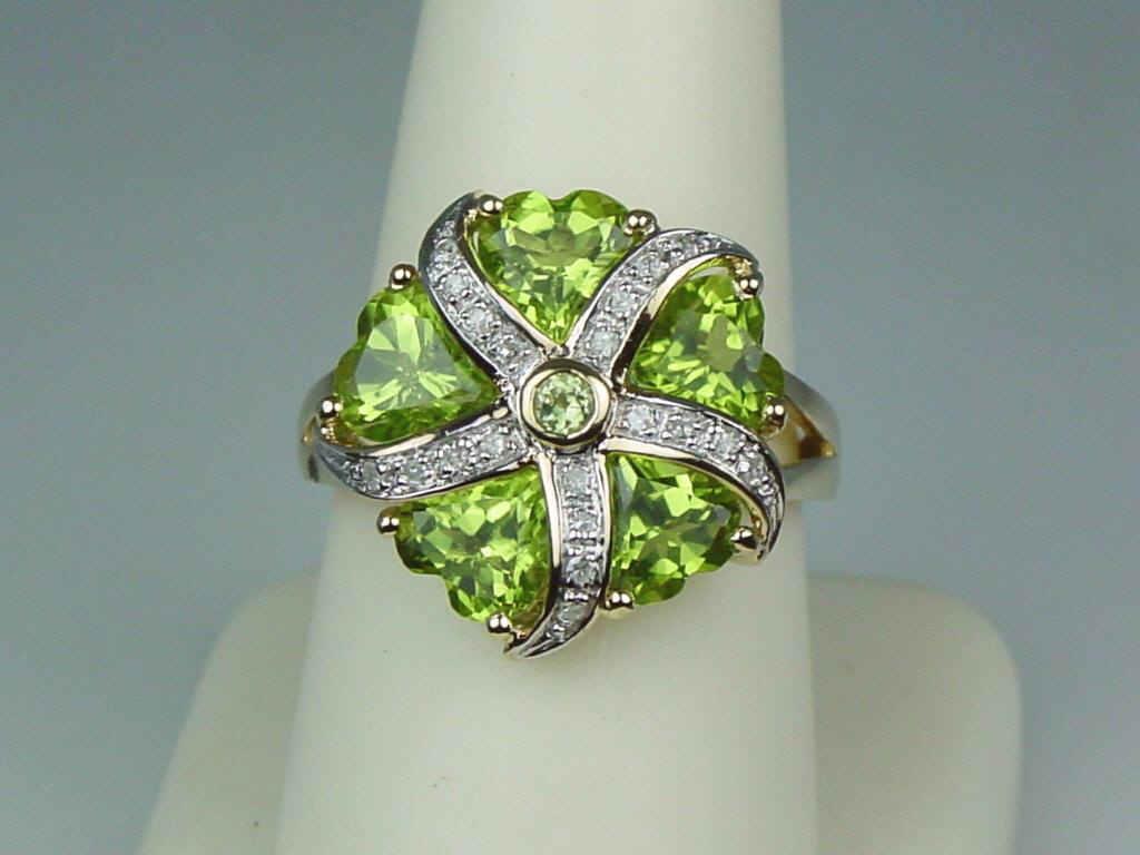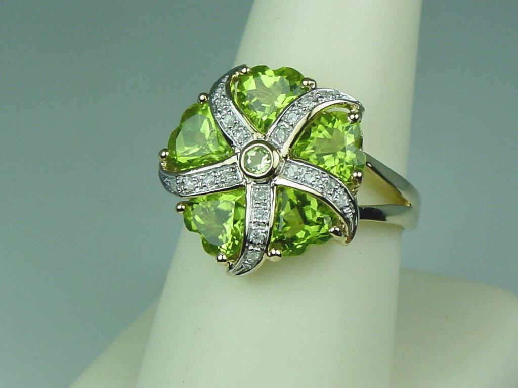 Ladies 14K YG Custom Design Ring Fine set with 5 heart shape green Peridot weighing approx. 4.00 carats and pave set with over 20 round diamonds. Retail: $2,250.00Fine set with 5 heart shape green Peridot weighing approx. 4.00 carats and pave set with over 20 round diamonds. Retail: $2,250.00