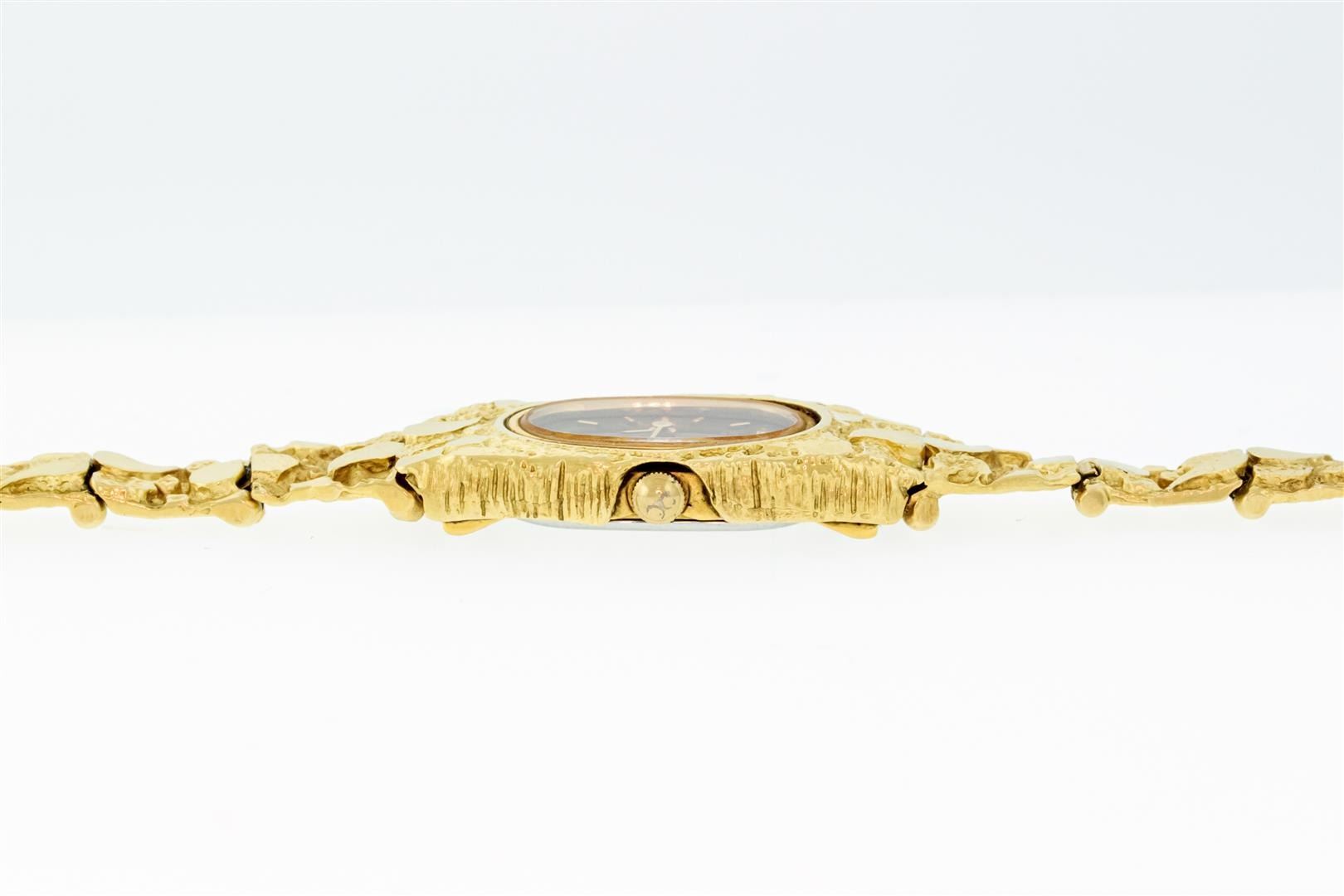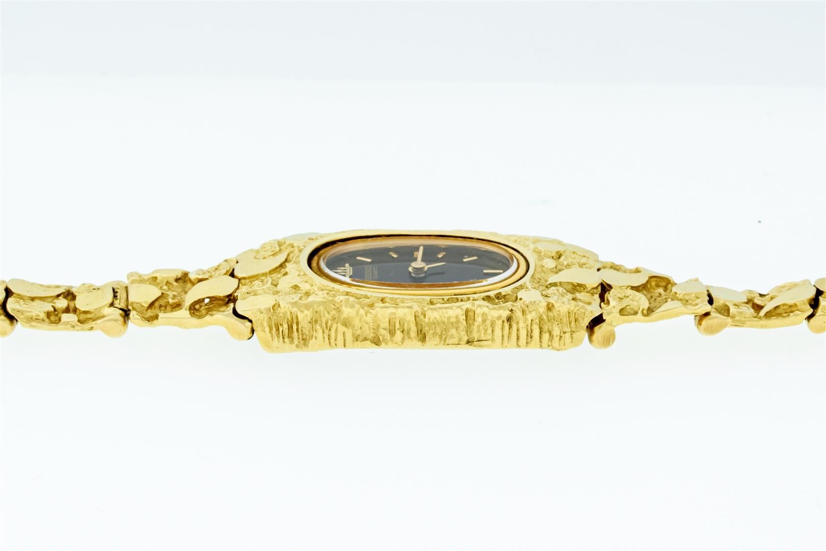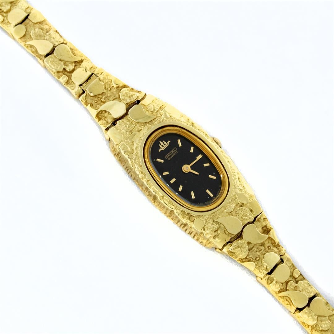 One Ladies Seiko Quartz 14K Solid Yellow Gold Nugget Wristwatch, This Watch Has Brand New Battery & Has Been Electronically Tested, 14K Solid Yellow Gold Case: 16MM X 26MM , Gold Seiko Crown, Bezel: 14K Gold Seiko Bezel, Seiko Crystal: Sapphire Crystal, Seiko Hands: Yellow Hands, Movement: Battery Operated Seiko Quartz Movement, Seiko Dial: Black Dial With Index Hour Markers, Model: Seiko Gold Nugget Wristwatch. Condition: G-6 Extra Fine. Bracelet: Solid 14K Yellow Gold Seiko Gold Nugget Bracelet. Bright Polish. Fits Up To 6.5 Inch Wrist, Gold Jewelry Clasp, This Watch Has Time Tested And Is In Excellent Condition. It Is Free Of All Scratches And Dents.