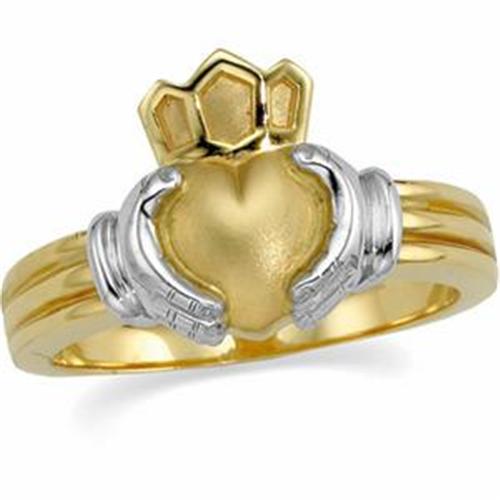 Ladies 14k Yellow Gold CLADDAGH ring with White Gold accents. This beautiful CLADDAGH RING is a Size 7 and it can be resized larger or smaller.
