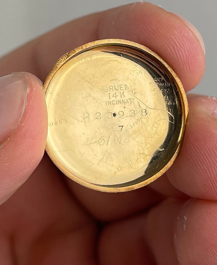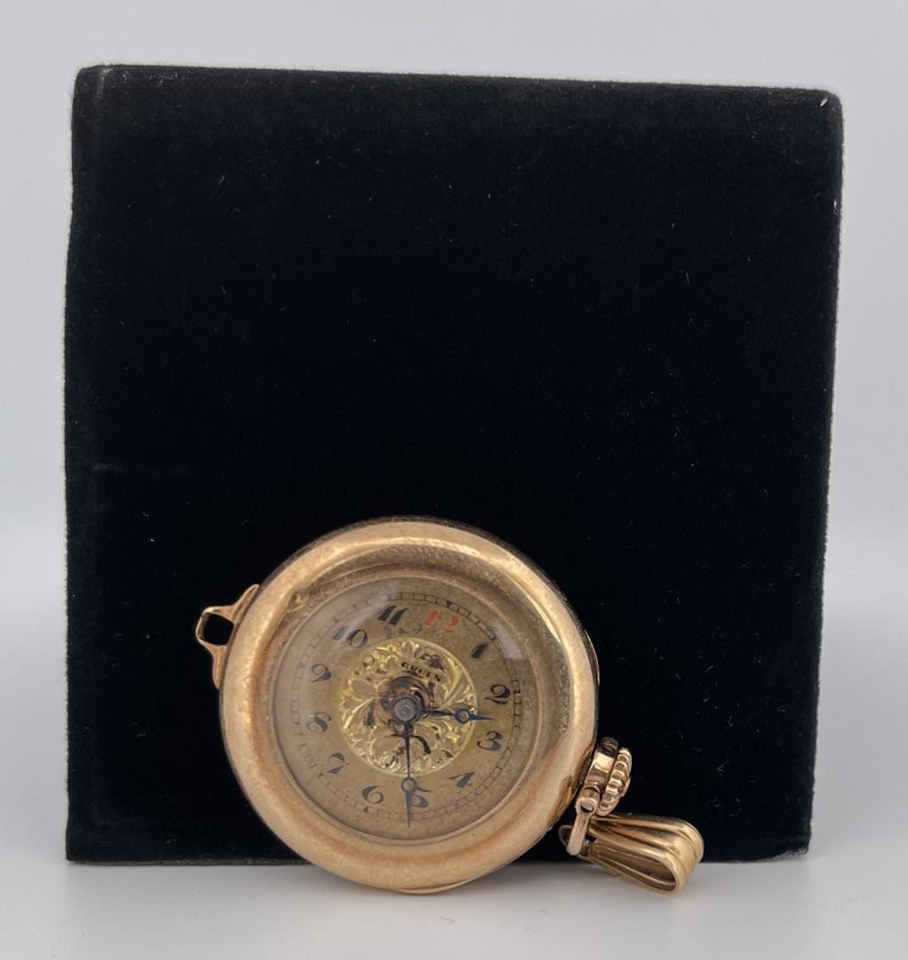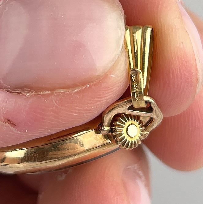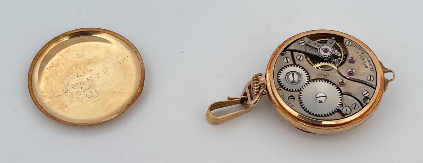 Nice watch. 14k Yellow Gold. Weight is 13.9 grams.