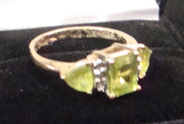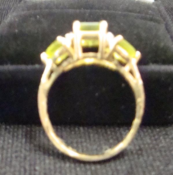 Pretty ring with three large green stones mounted in 14k gold.