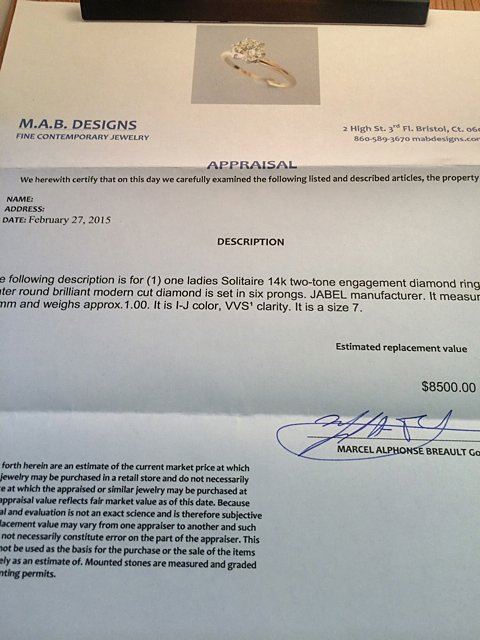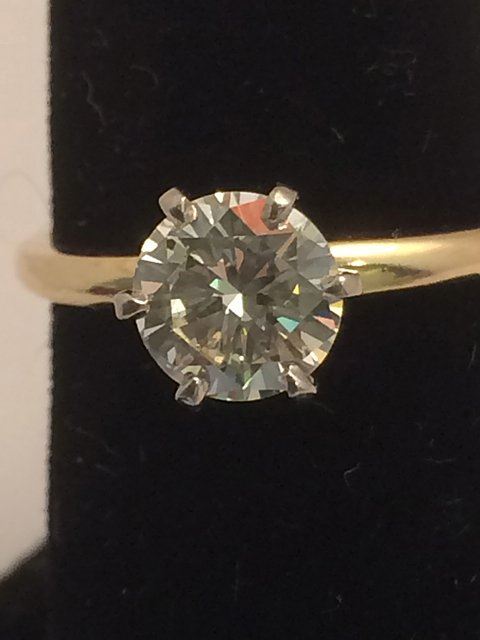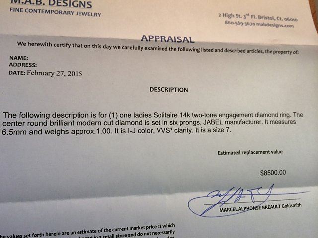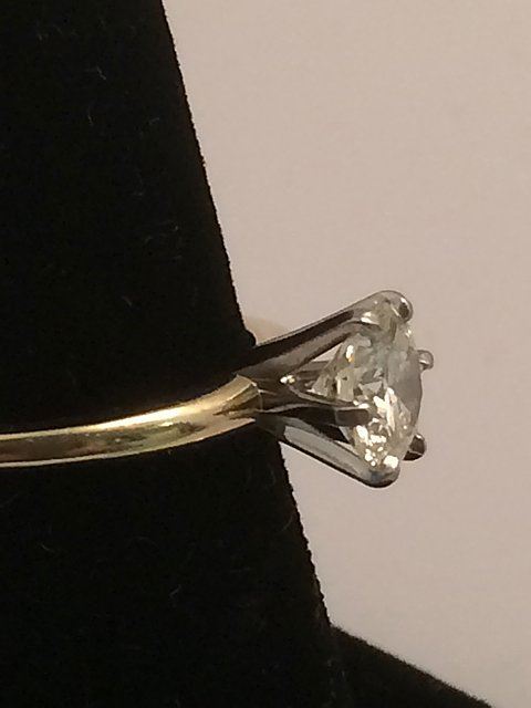 Ladies Solitaire 14kt two-tone engagement 1ct diamond ring. Center round brilliant modern cut diamond is set in six prongs. JABEL manufacturer. It measures 6.5mm and weighs approx. 1.00ct, I-J color, VVS1 clarity. Size 7. Appraisal value $8,500.00.