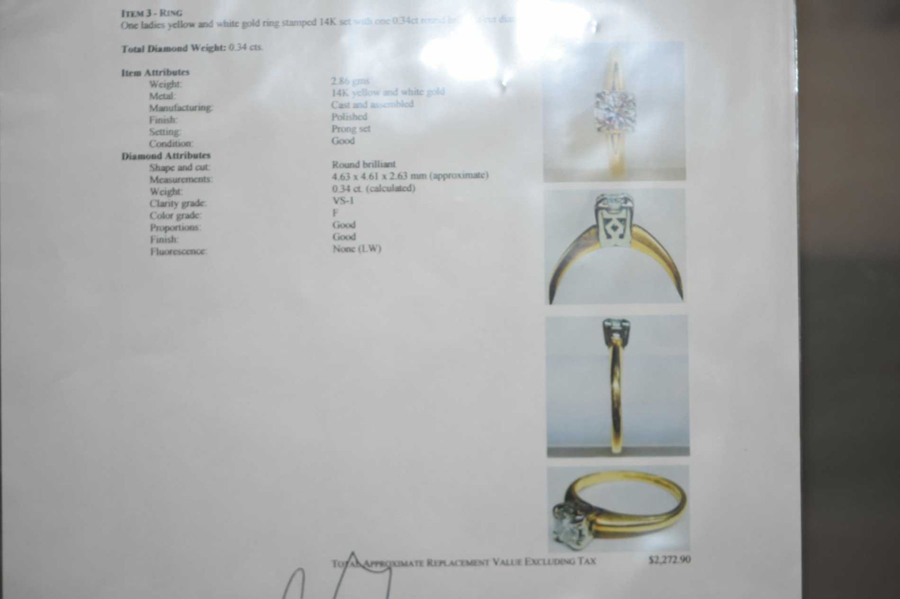 Ladies 14kt yellow and white gold diamond ring set with single 0.34ct solitaire diamond. Retail replacement value $2,272.00