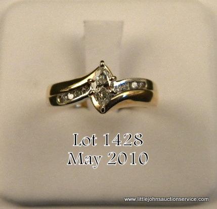 Ladies 14kt yellow gold ring set with one marquise cut weighing approx. .33 carat with small diamonds. $225-$450.