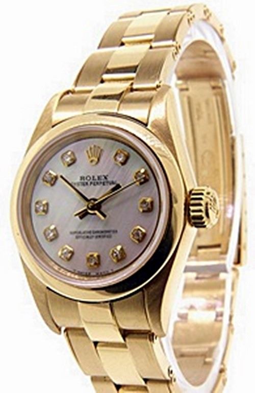 Manufacturer: Rolex , Model Name: Oyster Perpetual , Model Number: 76188 , Gender: Ladies , Circa: 2000 , Condition: Pre-Owned Polished and Overhauled, Case: 18K Yellow Gold 25mm Width , Movement: Automatic , Dial: Original Rolex Face Professionally Refinished with custom added White Mother of Pearl Stone and Genuine Diamonds , Bezel: 18K Yellow Gold, Crown: 18K Yellow Gold , Bracelet/Strap: Original Rolex Band Rivetted Oyster Model 18K Yellow Fold Fits up to 7 Inches , Crystal: Sapphire , Calander: No Date , Box/Papers: NONE