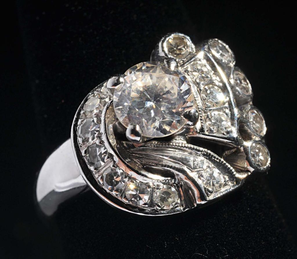 Circa 1955. Large, brilliant cut 3/4 carat diamond with 1.0 carat smaller diamonds. Large stone is clean and clear. Jewelry Condition (Excellent).