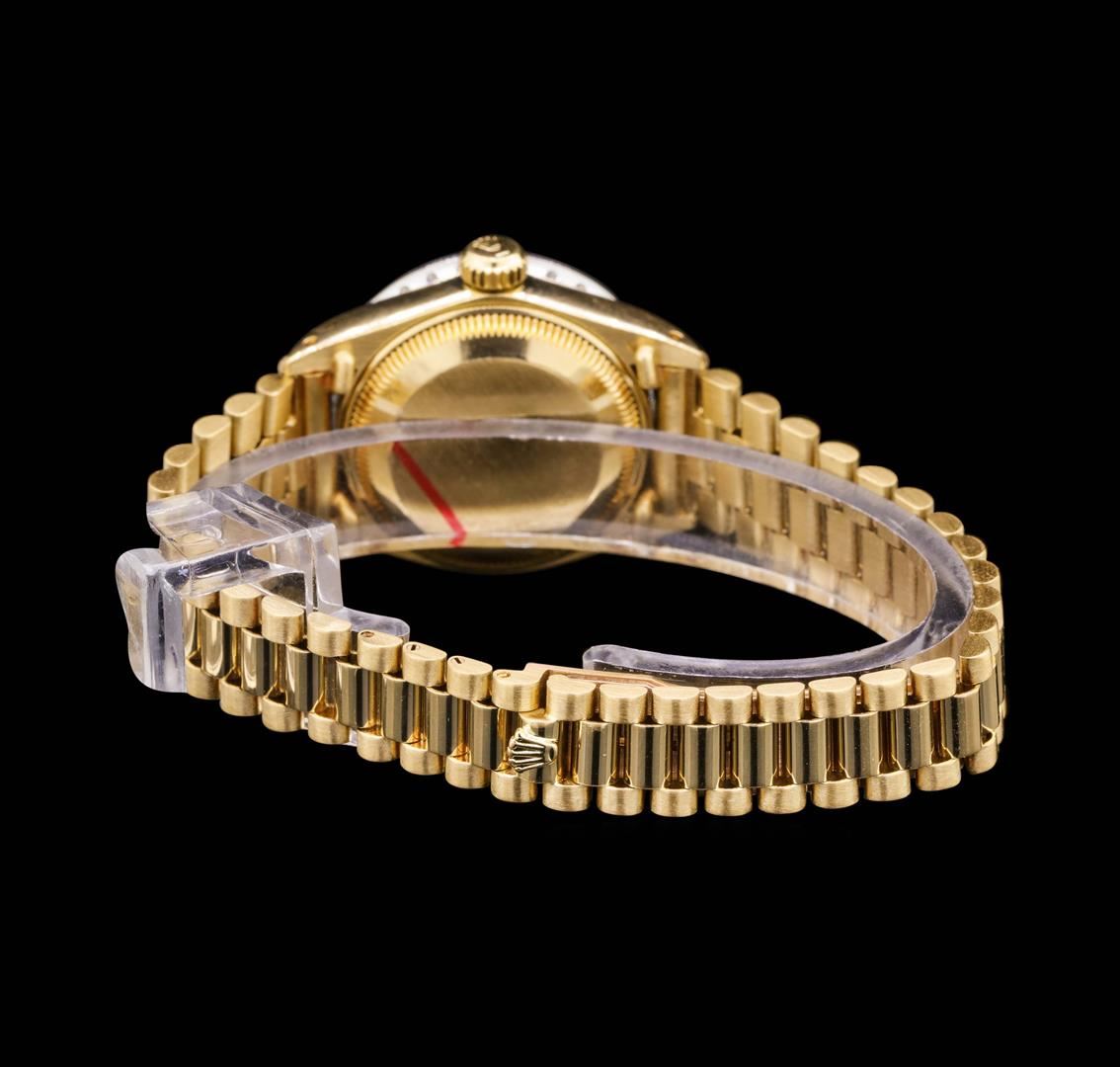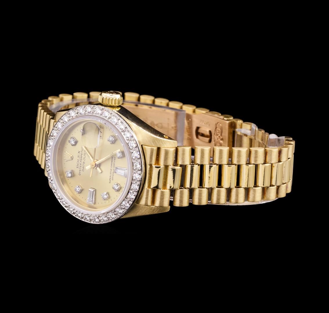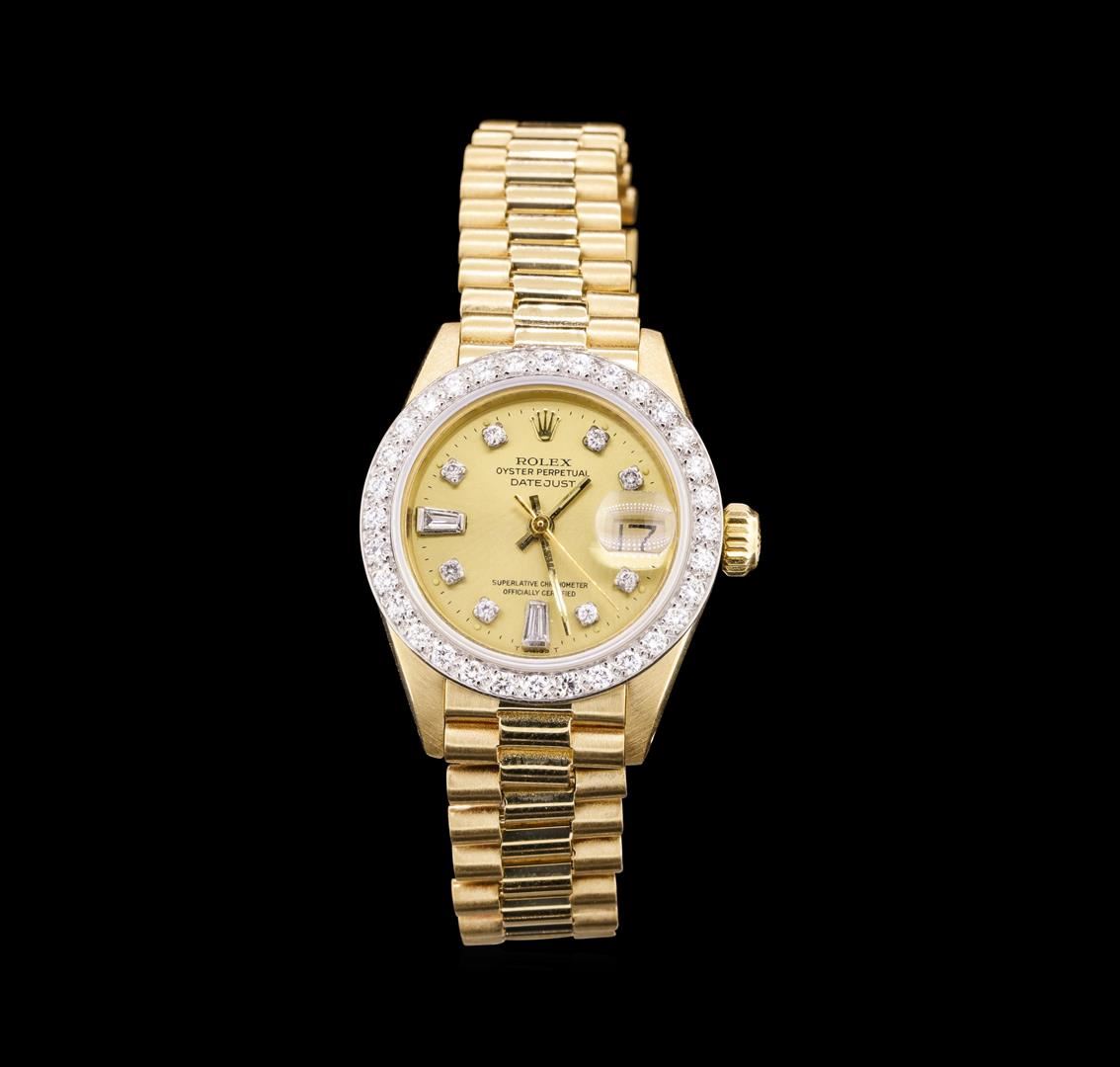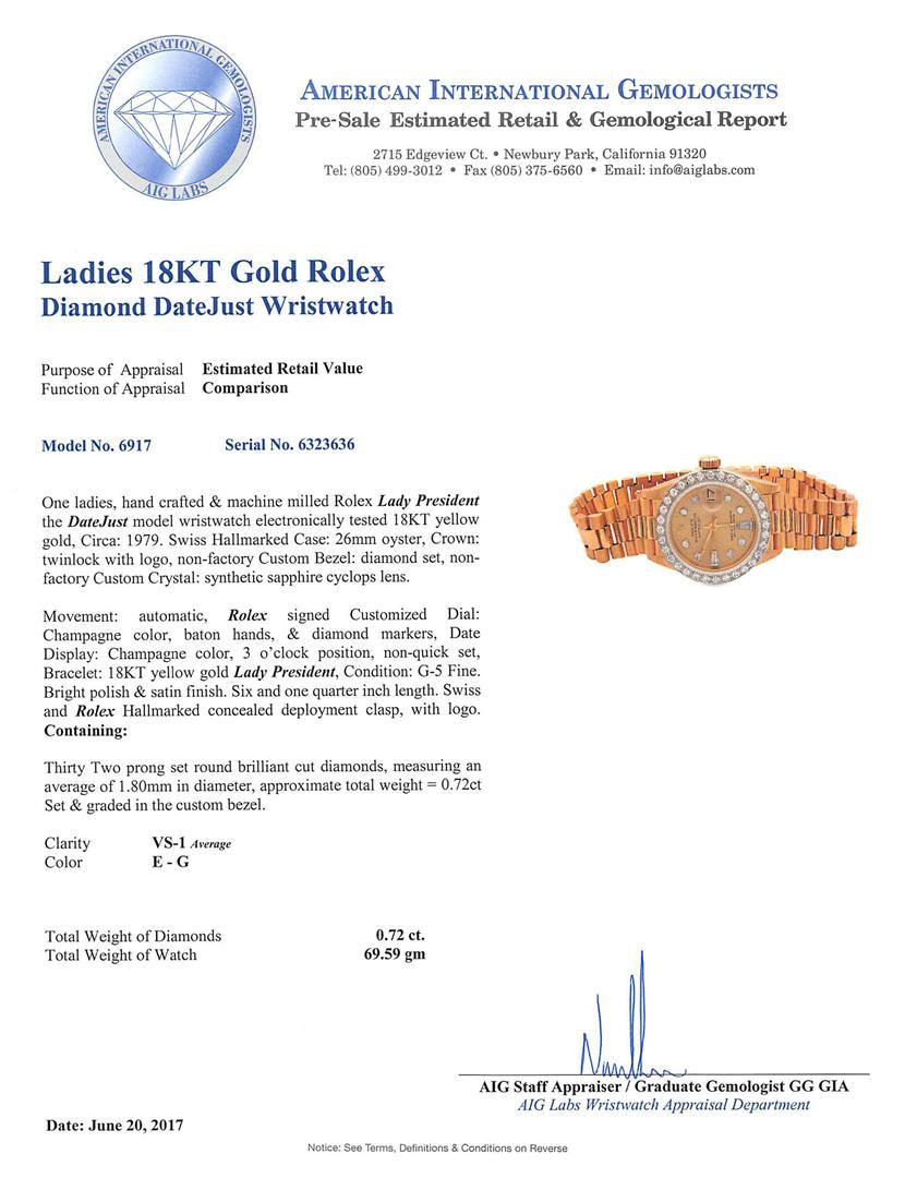 One ladies, hand crafted & machine milled Rolex Lady President the DateJust model wristwatch electronically tested 18KT yellow gold, Circa: 1979. Swiss Hallmarked Case: 26mm oyster, Crown: twinlock with logo, non-factory Custom Bezel: diamond set, Custom Crystal: synthetic sapphire cyclops lens.Movement: automatic, Rolex signed Customized Dial: Champagne color, baton hands, & diamond markers, Date Display: Champagne color, 3 o'clock position, non-quick set, Bracelet: 18KT yellow gold Lady President, Condition: G-5 Fine. Bright polish & satin finish. Six and one quarter inch length. Swiss and Rolex Hallmarked concealed deployment clasp, with logo. Containing:Thirty Two prong set round brilliant cut diamonds, measuring an average of 1.80mm in diameter, approximate total weight = 0.72ct Set & graded in the custom bezel. Clarity VS-1 Average. Color: E - G. Total Weight of Diamonds 0.72ct. Total Weight of Watch 69.59gm. AIG Appraised.