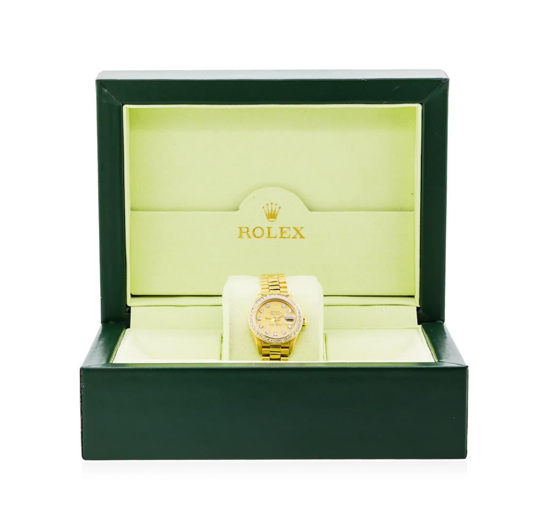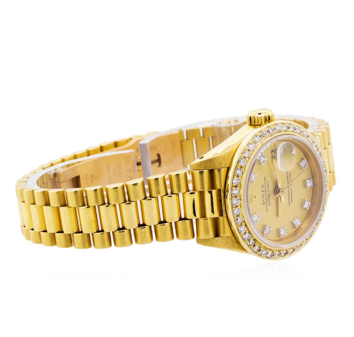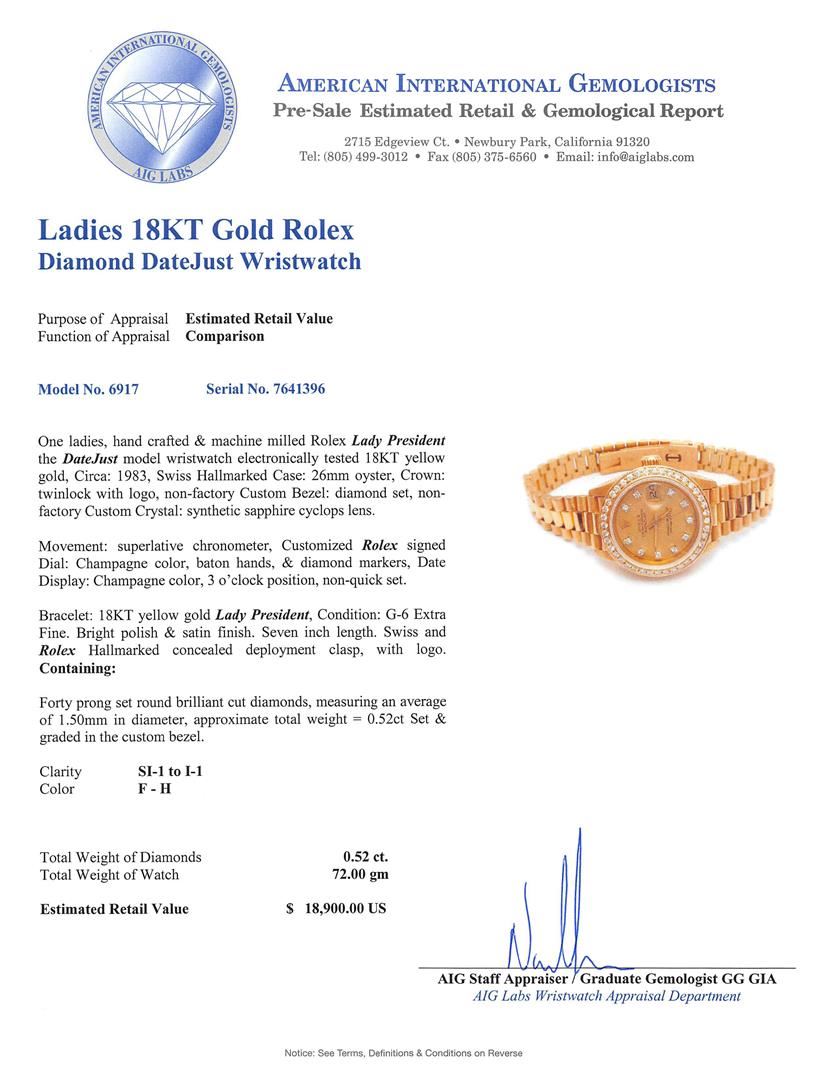 One ladies, hand crafted & machine milled Rolex Lady President the DateJust model wristwatch electronically tested 18KT yellow gold, Circa: 1983, Swiss Hallmarked Case: 26mm oyster, Crown: twinlock with logo, non-factory Custom Bezel: diamond set, non-factory Custom Crystal: synthetic sapphire cyclops lens. Movement: superlative chronometer, Customized Rolex signed Dial: Champagne color, baton hands, & diamond markers, Date Display: Champagne color, 3 o'clock position, non-quick set. Bracelet: 18KT yellow gold Lady President, Condition: G-6 Extra Fine. Bright polish & satin finish. Seven inch length. Swiss and Rolex Hallmarked concealed deployment clasp, with logo. Containing: Forty prong set round brilliant cut diamonds, measuring an average of 1.50mm in diameter, approximate total weight = 0.52ct Set & graded in the custom bezel. Clarity SI-1 to I-1. Color: F - H. Total Weight of Diamonds 0.52ct. Total Weight of Watch 72.00gm. This watch also comes with Appraisal and Box. AIG Appraised at $18,900.00.