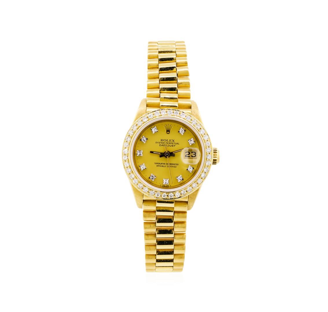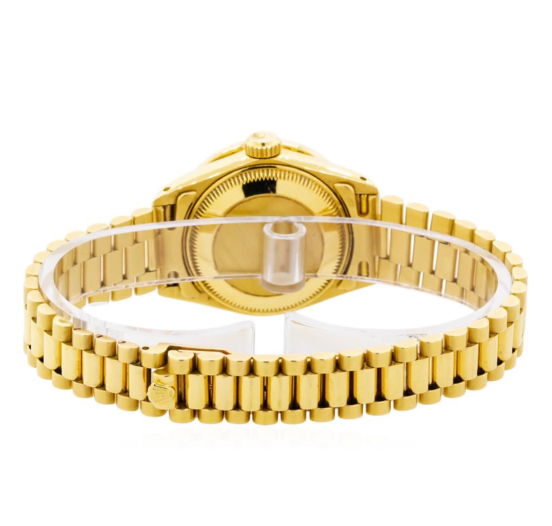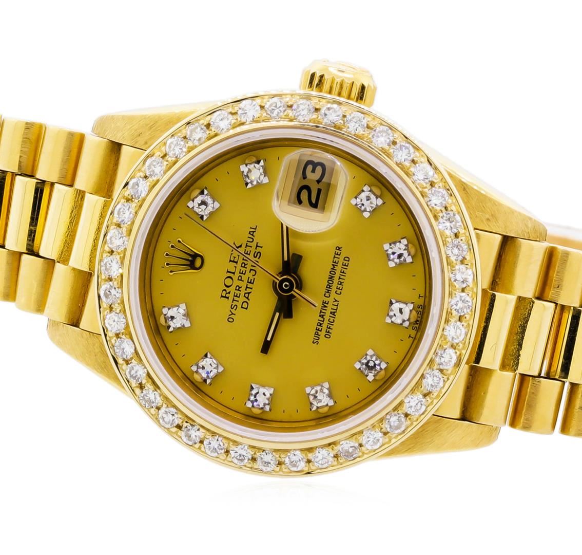 One ladies, hand crafted & machine milled Rolex Lady President the DateJust model wristwatch electronically tested 18KT yellow gold, Circa: 1983, Swiss Hallmarked Case: 26mm oyster, Crown: twinlock with logo, non-factory Custom Bezel: diamond set, non-factory Custom Crystal: synthetic sapphire cyclops lens. Movement: superlative chronometer, Customized Rolex signed Dial: Champagne color, baton hands, & diamond markers, Date Display: Champagne color, 3 o'clock position, non-quick set. Bracelet: 18KT yellow gold Lady President, Condition: G-6 Extra Fine. Bright polish & satin finish. Seven inch length. Swiss and Rolex Hallmarked concealed deployment clasp, with logo. Containing: Forty prong set round brilliant cut diamonds, measuring an average of 1.50mm in diameter, approximate total weight = 0.52ct Set & graded in the custom bezel. Clarity SI-1 to I-1. Color: F - H. Total Weight of Diamonds 0.52ct. Total Weight of Watch 72.00gm. This watch also comes with Appraisal and Box. AIG Appraised at $18,900.00.