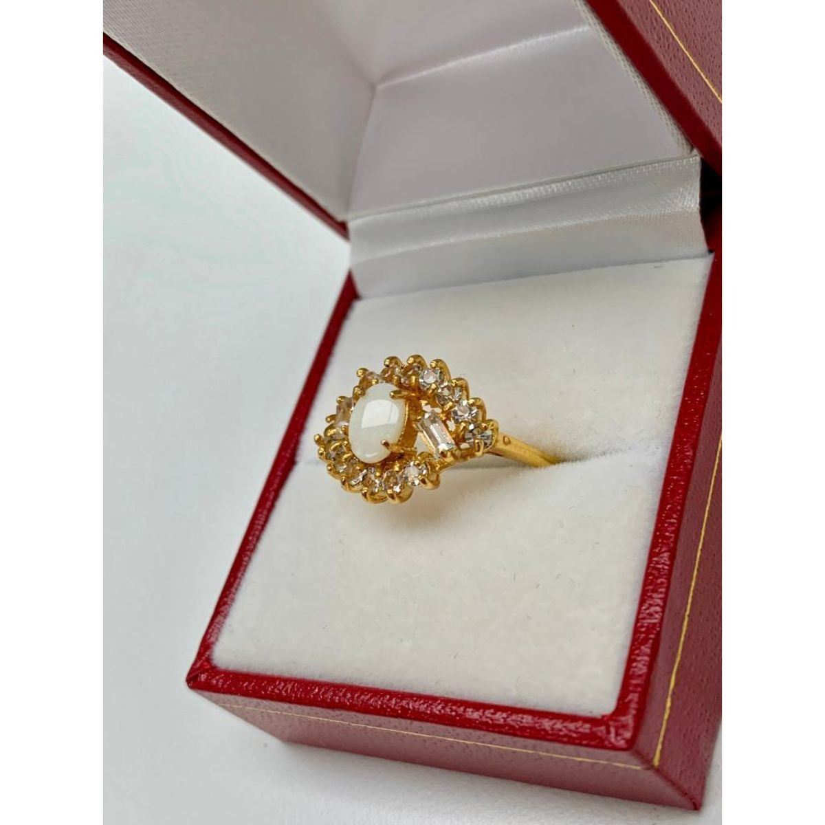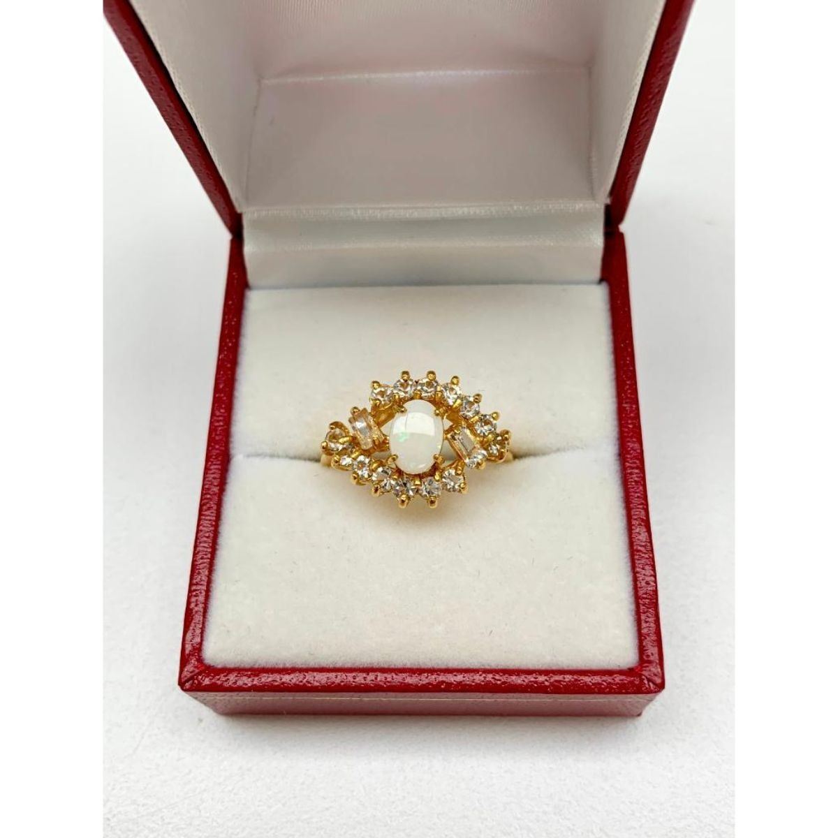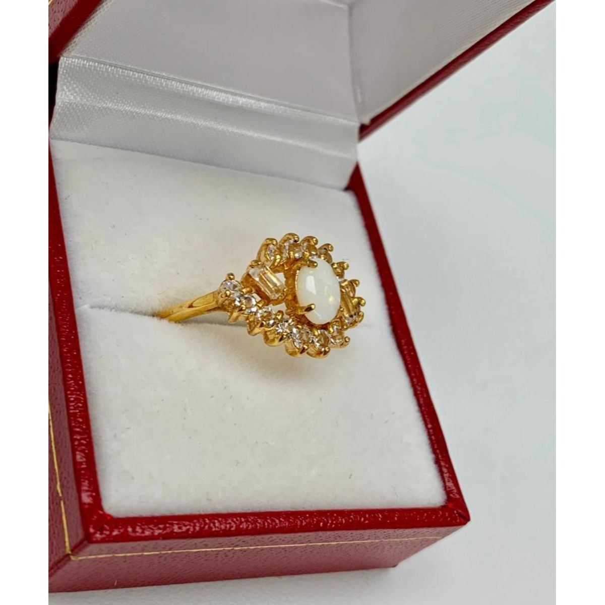 Ladies Size 9 Oval Cut White Opal set in 18K Gold Plated Ring. The Opal is a seductive stone that intensifies emotional states and releases inhibitions. It can also act as an emotional stabilizer. The ring is also hallmarked, Please view photos for further details.Â