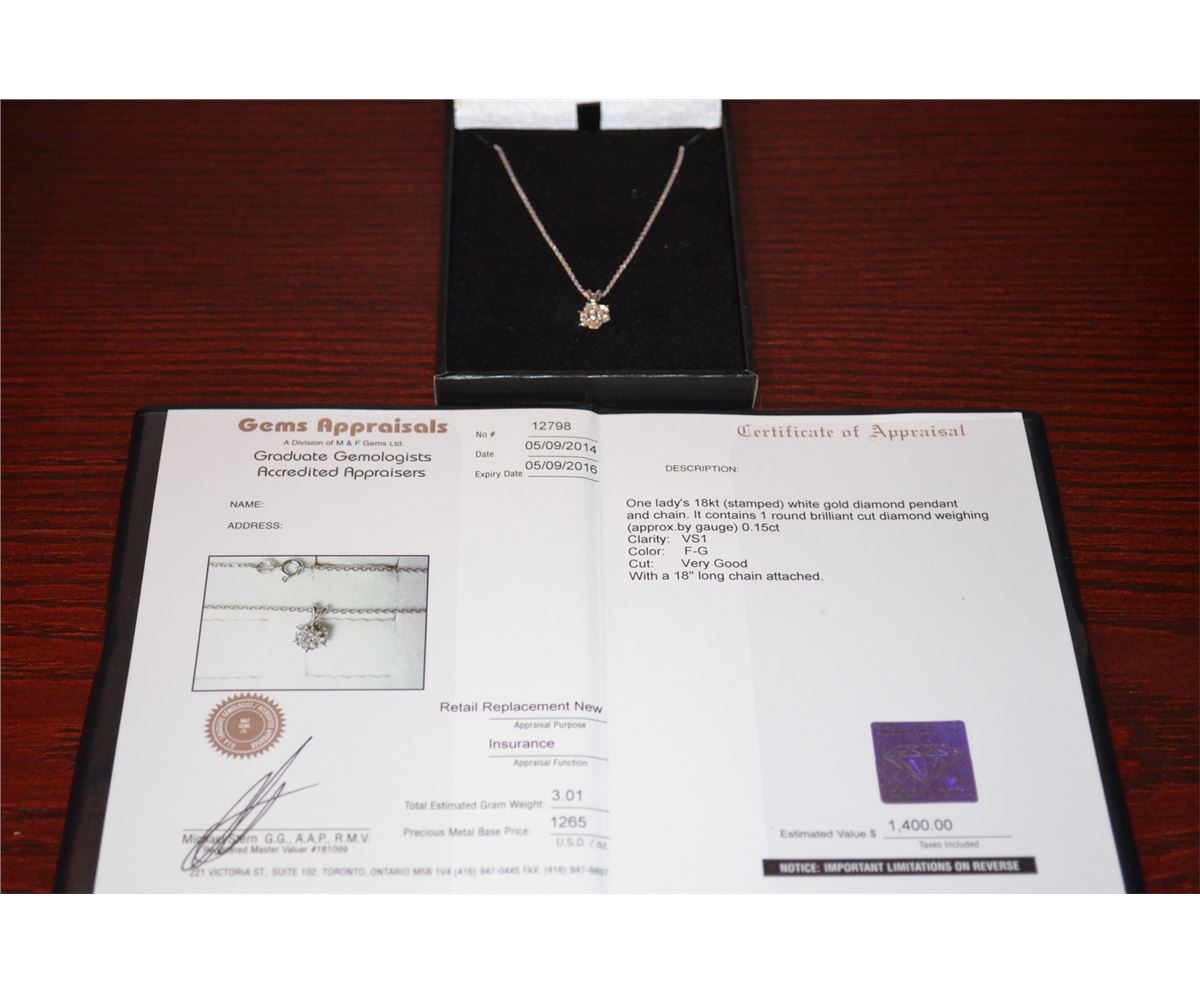 Ladies 18kt Diamond Pendant and Chain. 1 Diamond. Clarity: VS1. Color: F-G With 18' Chain. Estimated Value: $1400.00