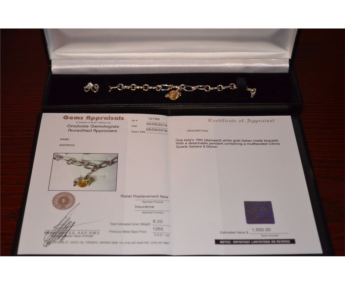Ladies 18kt Italian Made Bracelet. Citrine Quartz Sphere. Estimated Value: $1,550.00.