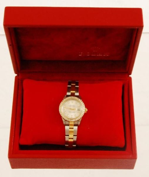 With box. Oyster perpetual, Date Just. Silver diamond dial and diamond bezel. Serial #Y610890. Model #79173.
