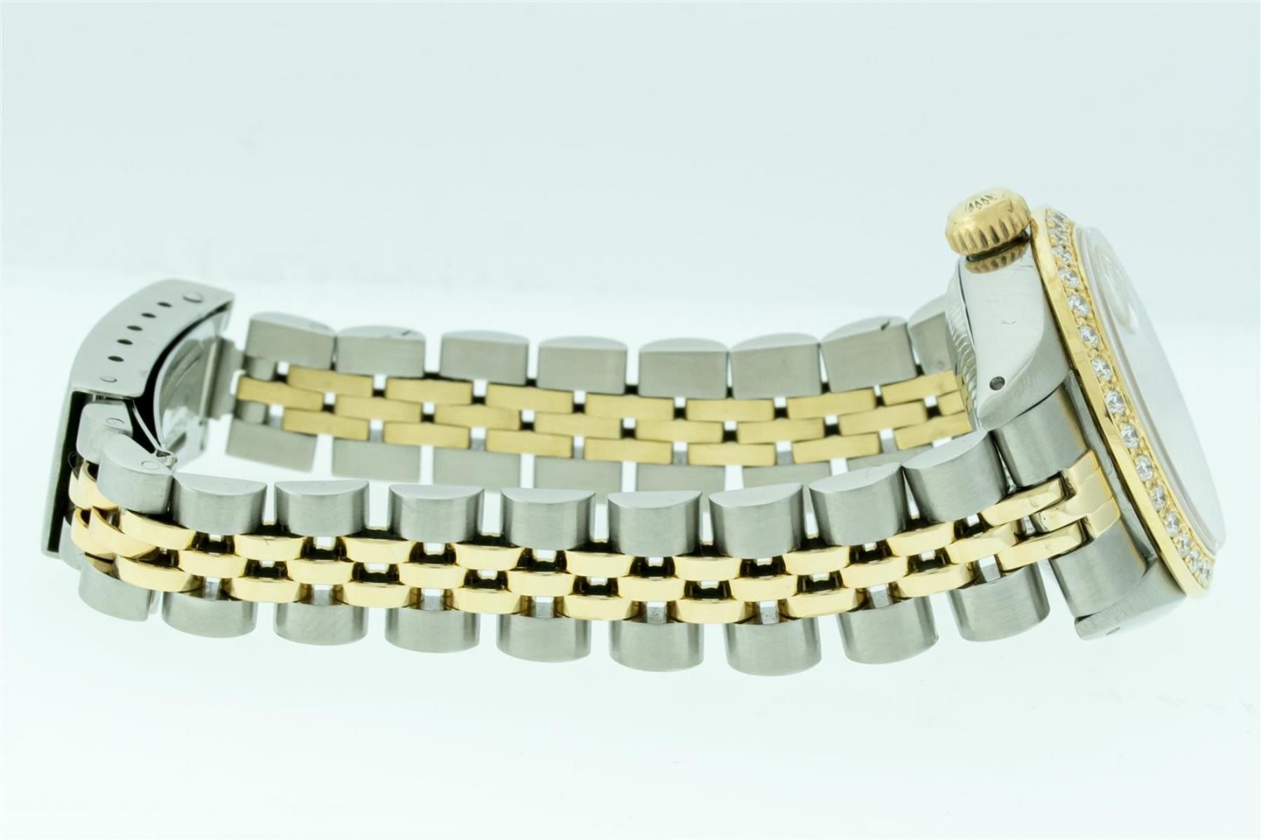 One Ladies Two Tone Rolex Datejust Polished, Serviced & Electronically Tested, Yellow Gold & Stainless Steel Case: 26mm, Yellow Gold Crown, Custom Bezel: New 18K .70ctw Yellow Gold Beadset Diamond Bezel, Diamond Count: 32 Diamonds, Total Weight .70 Carat, Clarity: Si-VS, Color: G to H. Custom Crystal: New Scratch Resistant Synthetic Sapphire Cyclops Lens. Custom Hands: New Gold Hands. Movement: Automatic Winding Movement. Custom Dial: Silver Diamond Dial, Diamond Count: 10 Single Cut Diamonds in Dial, G To H In Color, VS Clarity. Date Window: 3 O'Clock Position Date Display, Model: Datejust, Condition: G-6 Extra Fine. Bracelet: Two Tone Yellow Gold & Stainless Steel Jubilee Band. Bright Polish. 6.0 Inch Length, Adjustable. Standard Clasp, With Rolex Logo. This Watch Has Been Serviced Time Tested And Is In Excellent Condition It Is Free Of All Scratches And Dents.