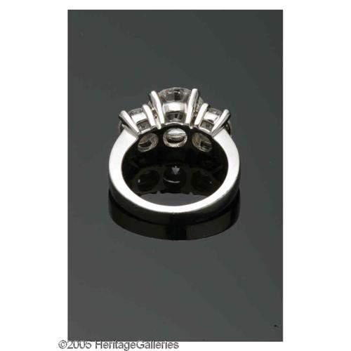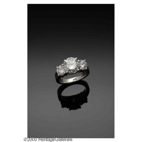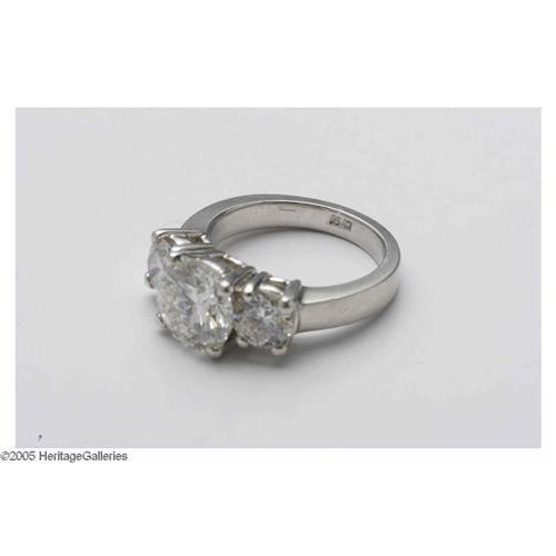 <B>A Ladies Platinum And Three Round Brilliant Cut Diamond Band</B></I><BR><BR>The platinum band weighing approximately 12.9 gms with center brilliant cut diamond of 3.21 Cts. (calculated), Clarity SI-2, Color I-J; to one side a brilliant cut diamond of .80 Cts. (calculated), Clarity SI-2, Color I-J; to the other side a brilliant cut diamond of .79 Cts. (calculated), Clarity SI-2, Color I-J<BR><BR> <I>Accompanied by G.I.A. Graduate Gemologist Appraisal</B></I>