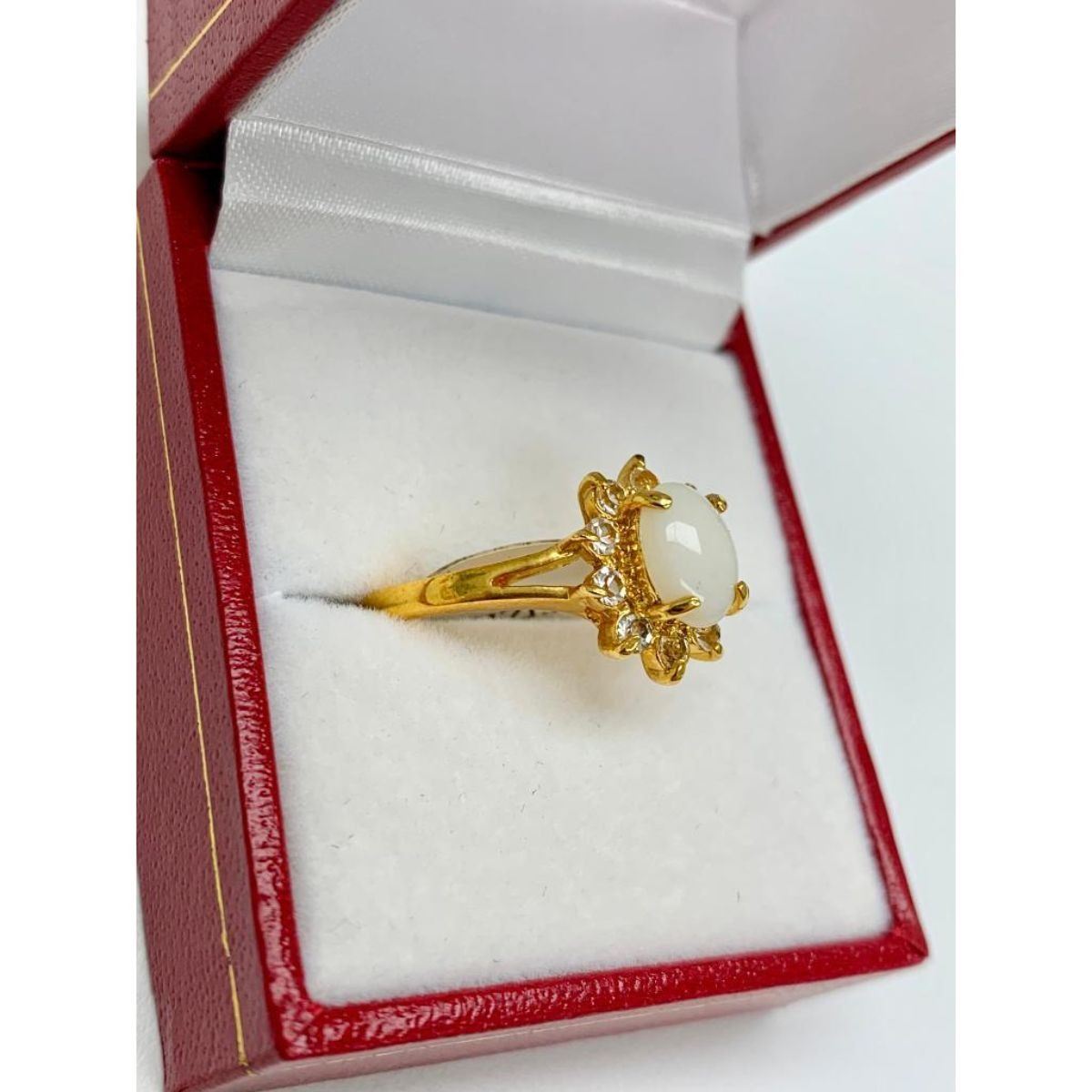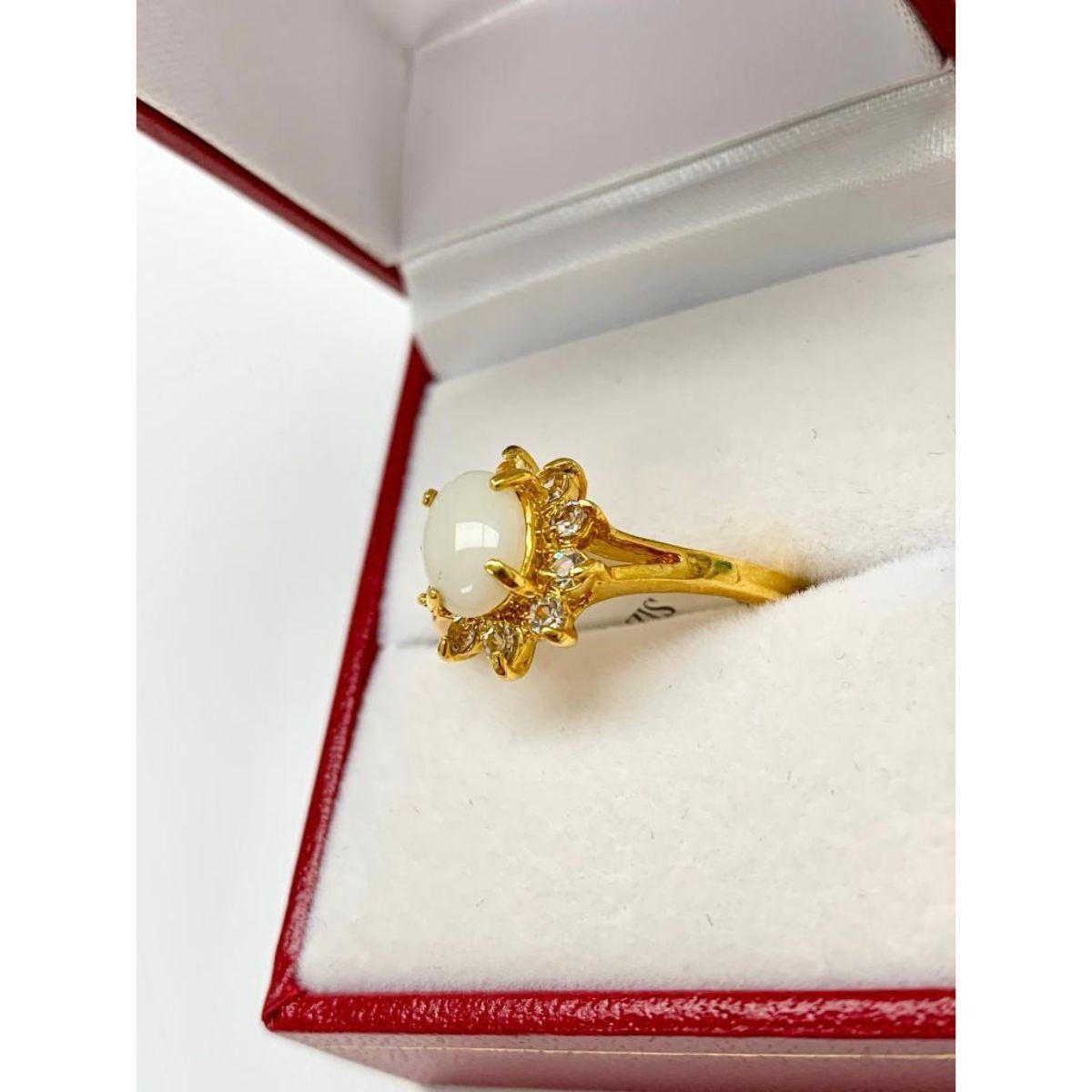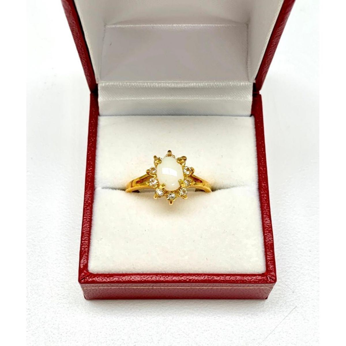 Ladies .34ct Size 9 Oval Cut White Opal set in 18K Gold Plated Ring. The Opal is the birthstone for the month of October, and is often given as a gift to symbolize 14 years of marriage. Please view photos for further details.Â