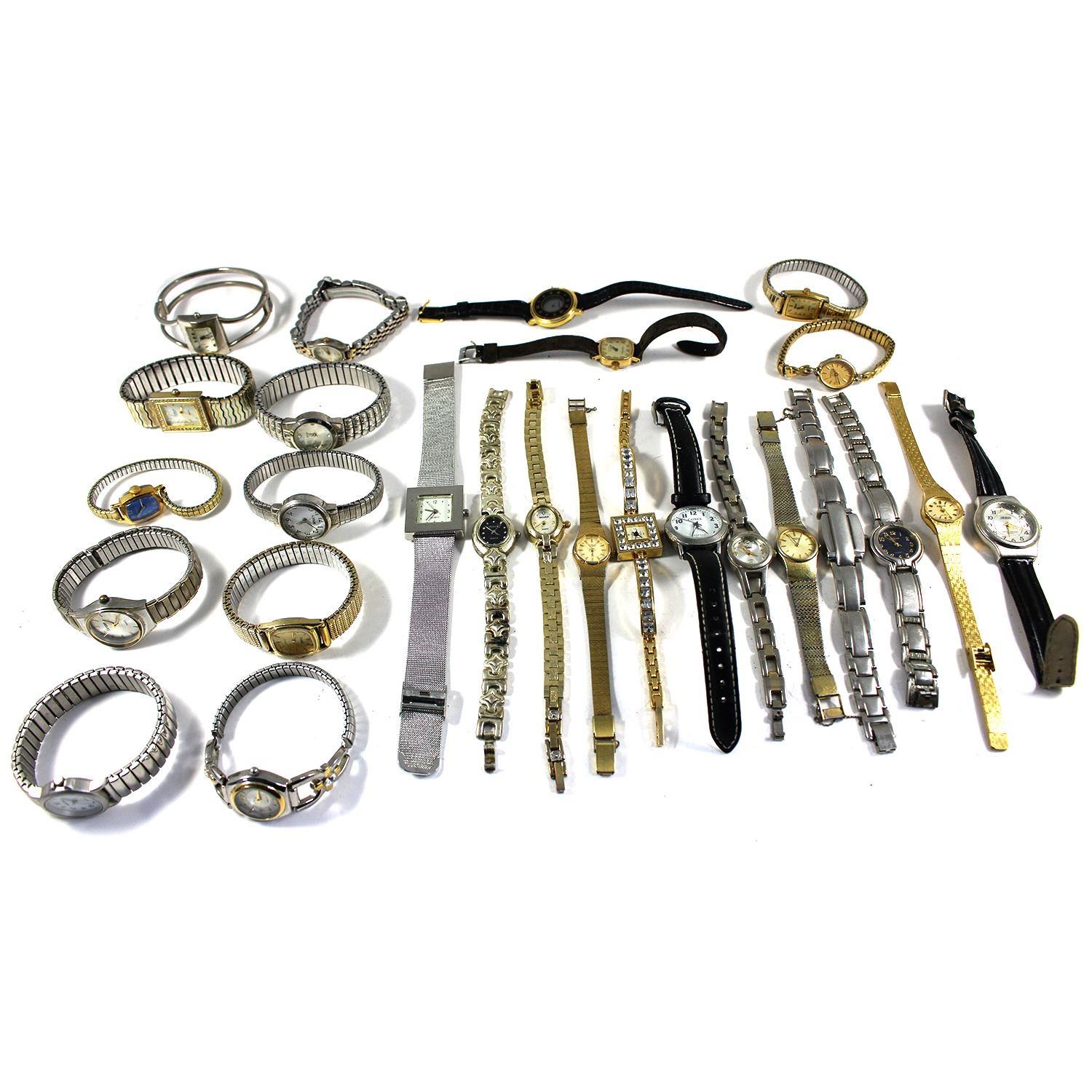 Twenty-six (26). Various origins. 1970s-2000s. Pulsar, Solo, etc. Gold plated, stainless steel. 17mm to 30mm case diameters. Running watches have not been tested for timekeeping accuracy and may require adjustment. The fact that a watch has been described as "running" provides no guarantee of its ability to continue to do so.
