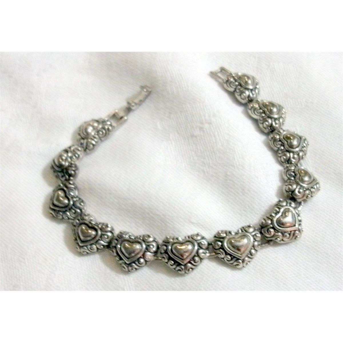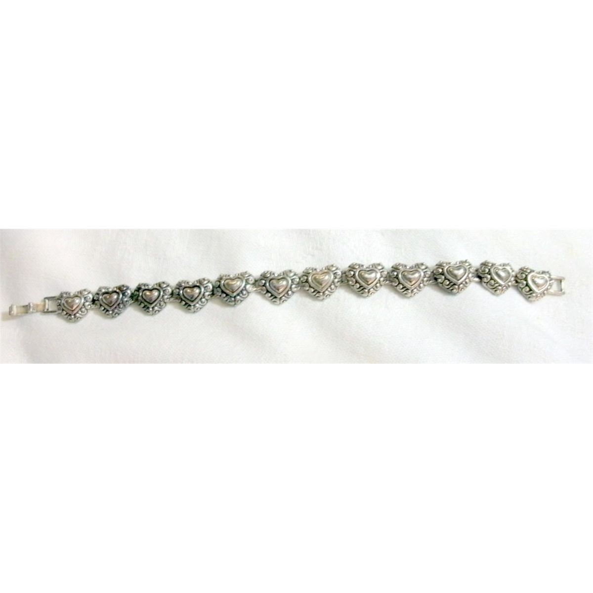 Ladies silver colored bracelet made of connecting hearts. Quite sweet. 7 1/2 inches