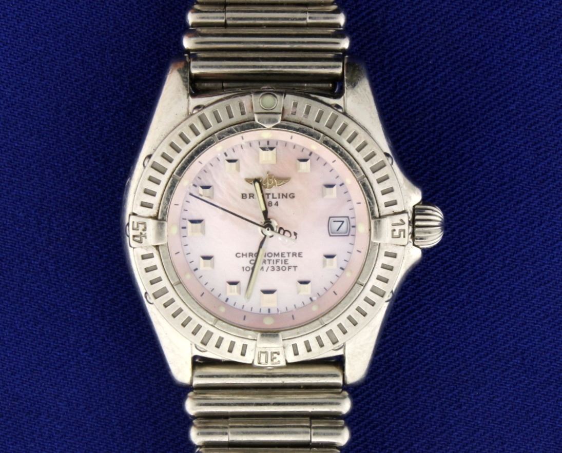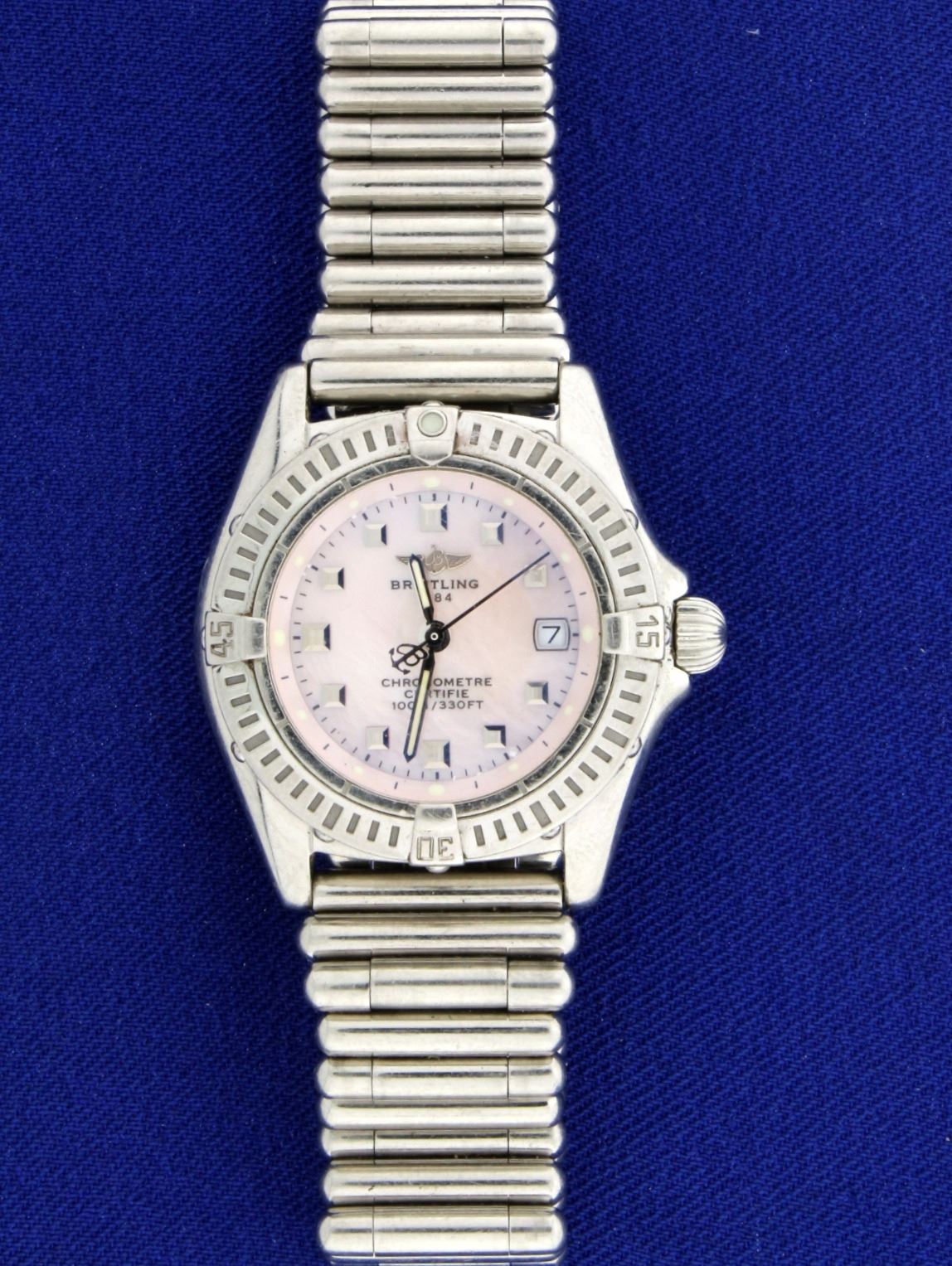In stainless steel. Watch is in excellent condition with no scratching on crystal and little signs of wear on case or band. Attractive Mother of Pearl Dial. Quartz movement runs perfectly with new battery.