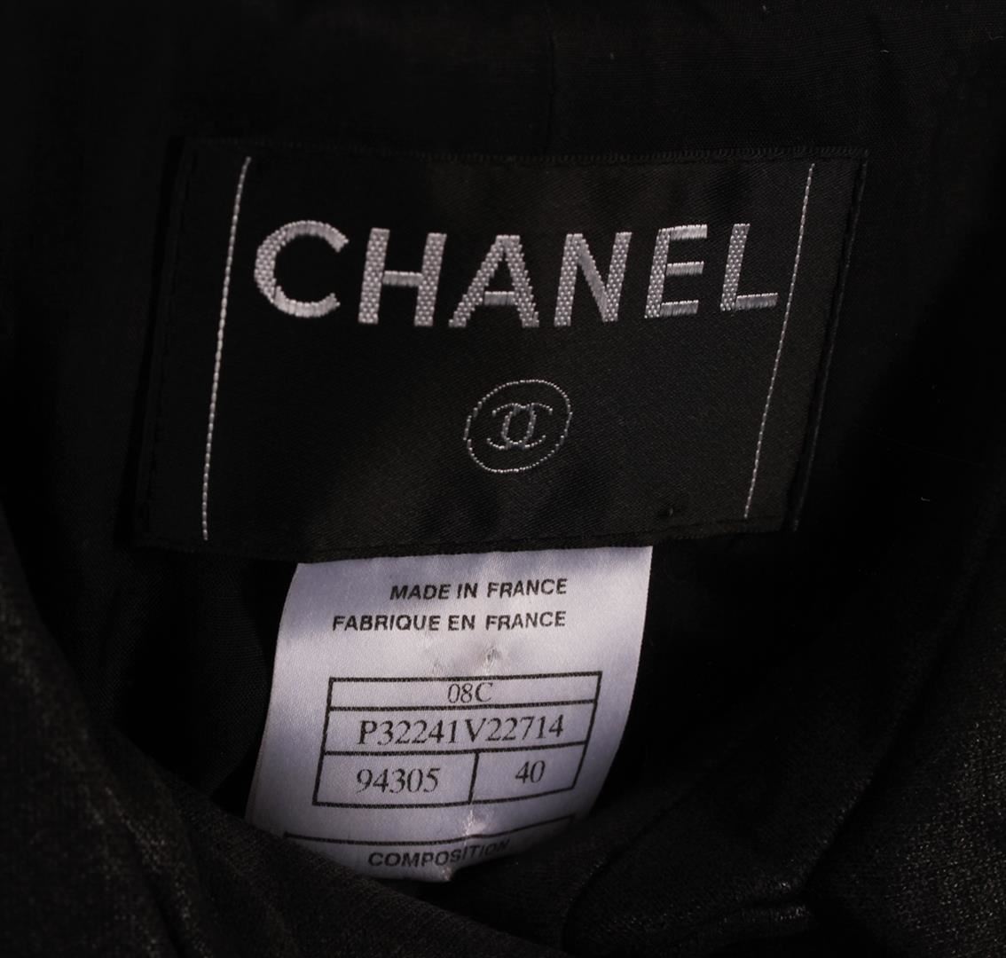 One Ladies Chanel Jacket. The outside of the jacket is composed of 90% cotton and 10% cashmere. The inside is composed of 100% silk. The jacket is in good condition. Made in France. Size as marked 40 (France).