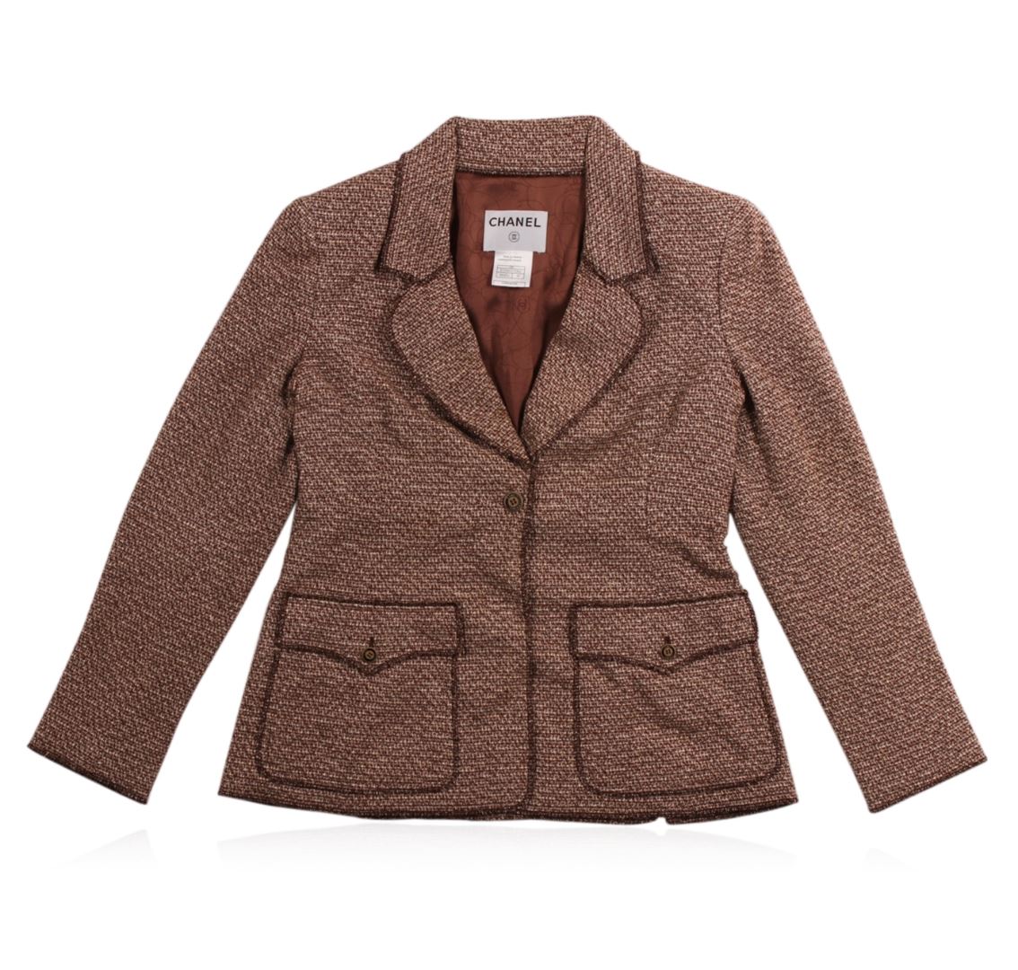 One Ladies Chanel Jacket. The outside of the jacket is composed of 38% silk, 32% cotton, 26% wool, and 4% nylon. The inside is composed of 95% silk and 5% spandex. The jacket is in good condition. Made in France. Size as marked 42 (France).
