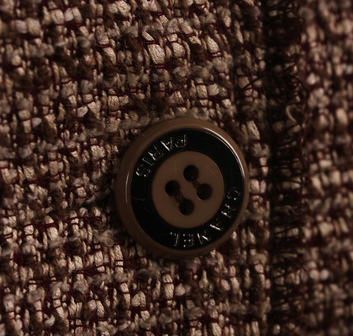 One Ladies Chanel Jacket. The outside of the jacket is composed of 38% silk, 32% cotton, 26% wool, and 4% nylon. The inside is composed of 95% silk and 5% spandex. The jacket is in good condition. Made in France. Size as marked 42 (France).