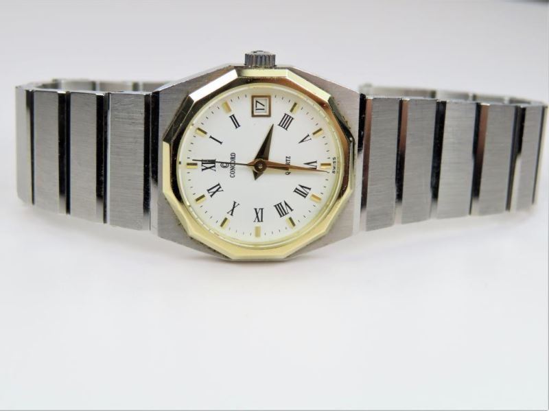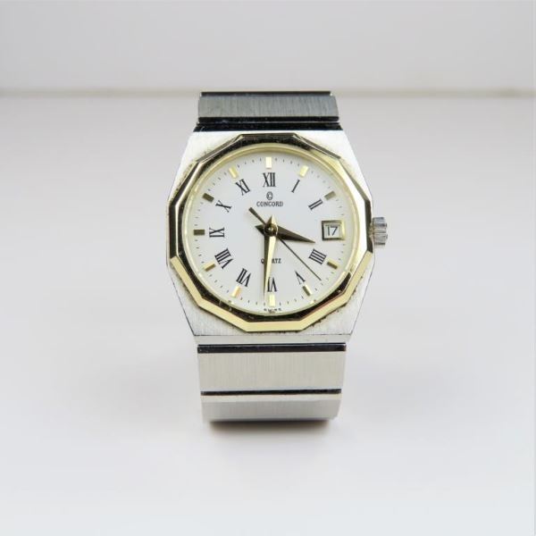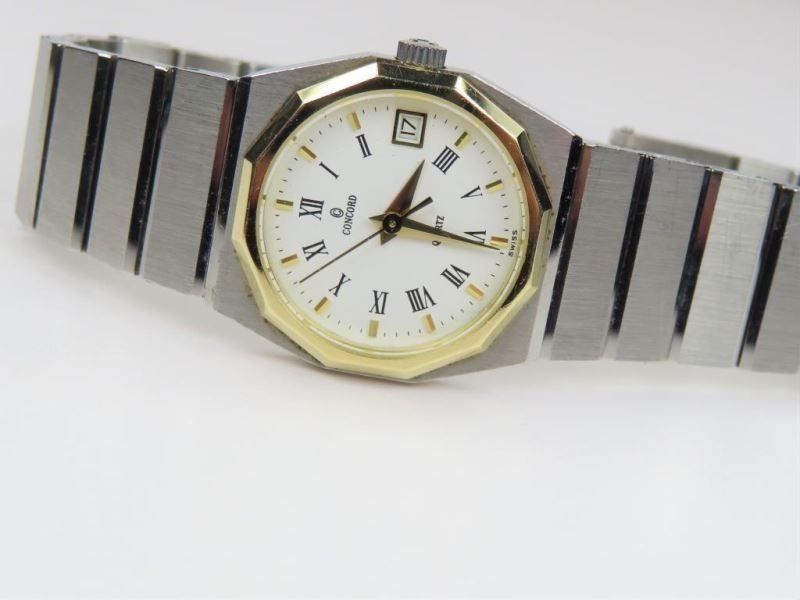 54. Luxury Ladies Concord Mariner SG Watch Swiss Made with 18 karat yellow gold bezel, brushed stainless steel body with Roman numerals, date, quartz movement with New Battery - Runs Great