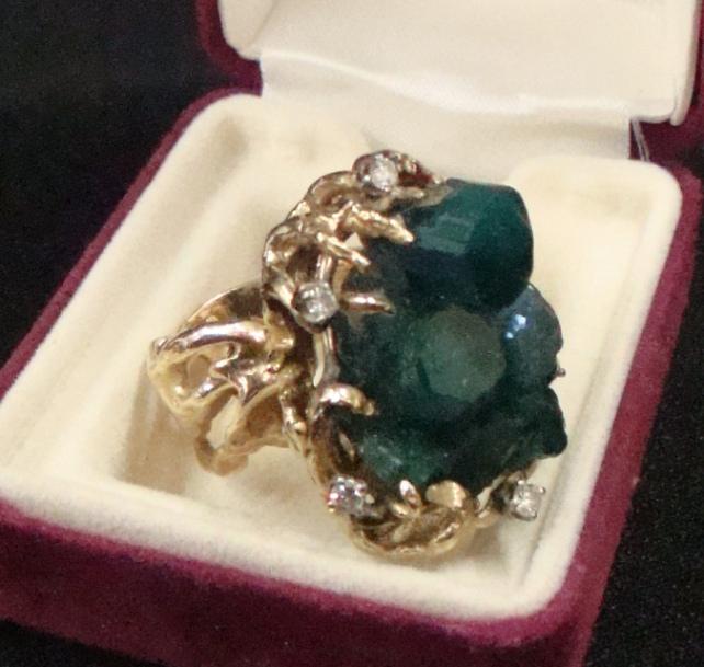 Beautiful ring set in 14k gold with large natural uncut emerald rock that measures 20mm x 11.3mm with a depth of 19.3mm. Accenting the emerald are six diamonds with clarity of SI1 and a color grade of G-H. High polish finish. Ring weighs 20.8 grams. Appraised value is $3195.